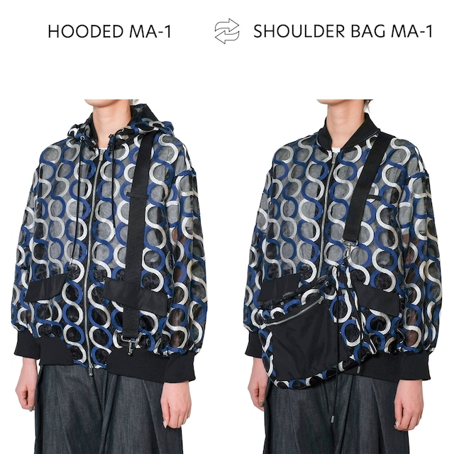 オーガンジーに2色のウェーブ状刺繍を施したオリジナルファブリックを使用した、シアー感が際立つフーデッドMA-1。 代表的なミリタリーアイテムであるMA-1を、透け感とインパクトのある素材で再構築し、洗練された印象に仕上げました。 本体のフードは着脱可能で、取り外すことでリブ衿のMA-1としても着用可能。 さらに、取り外したフードはショルダーバッグへと変形し、スタイルと機能性を兼ね備えた一着です。 【ギミック】 本体のフードは、左右2本のファスナーによって着脱可能です。 取り外したフードのファスナー同士を閉じることで、フードはバッグの形状へと変形します。 さらに、本体に取り付けられているショルダーテープを引き抜き、バッグに装着することで、ショルダーバッグとしてご使用いただけます。 【本体生地】サークル刺繍グラスオーガンザ 綿糸とレーヨン糸でそれぞれウェーブ状の刺繍を施し、色彩と質感のコントラストを表現したオリジナルファブリック。 刺繍のラインが折り重なることで、見る角度や光の加減によってサークル状の視覚変化が現れ、動きのある表情を生み出します。 基布には、丸断面の高透過ポリエステル糸を使用したグラスオーガンザを採用。 まるでガラスのような高い透明感と上品な光沢を持ち、軽やかでありながらしっかりとしたハリとコシを備えています。 ご家庭でのお洗濯が可能です。 ・手洗い推奨 ・洗濯後は形を整えて影干しして下さい ---MADE IN JAPAN--- 品番:CH2509-007 サイズ:Free 素材:表地:基布/ポリエステル100% 刺繍部分:綿50% レーヨン50% 別布:ポリエステル83% 綿17% 裏地:ポリエステル100% リブ:ポリエステル95% ポリウレタン5% 着丈:75cm バスト:112cm 肩巾:54cm 袖丈:53cm お客様のご都合による返品・交換は承っておりませんのでご了承下さい。 お客様のモニターのご利用環境によっては、商品の色の見え方が多少異なる場合がございますので、ご注意の上お買い求め下さい。 柄の配置は、商品によって異なる場合がございます。