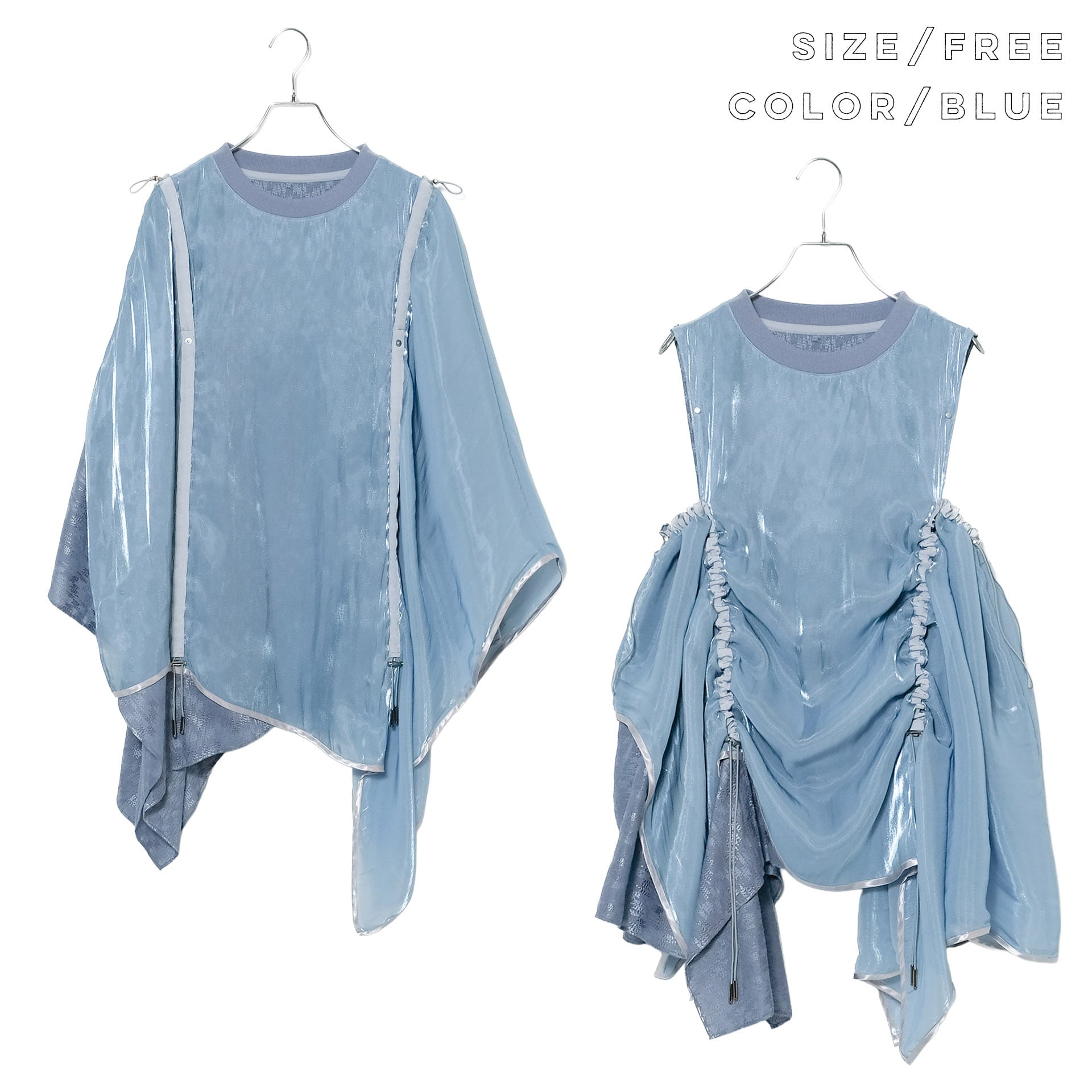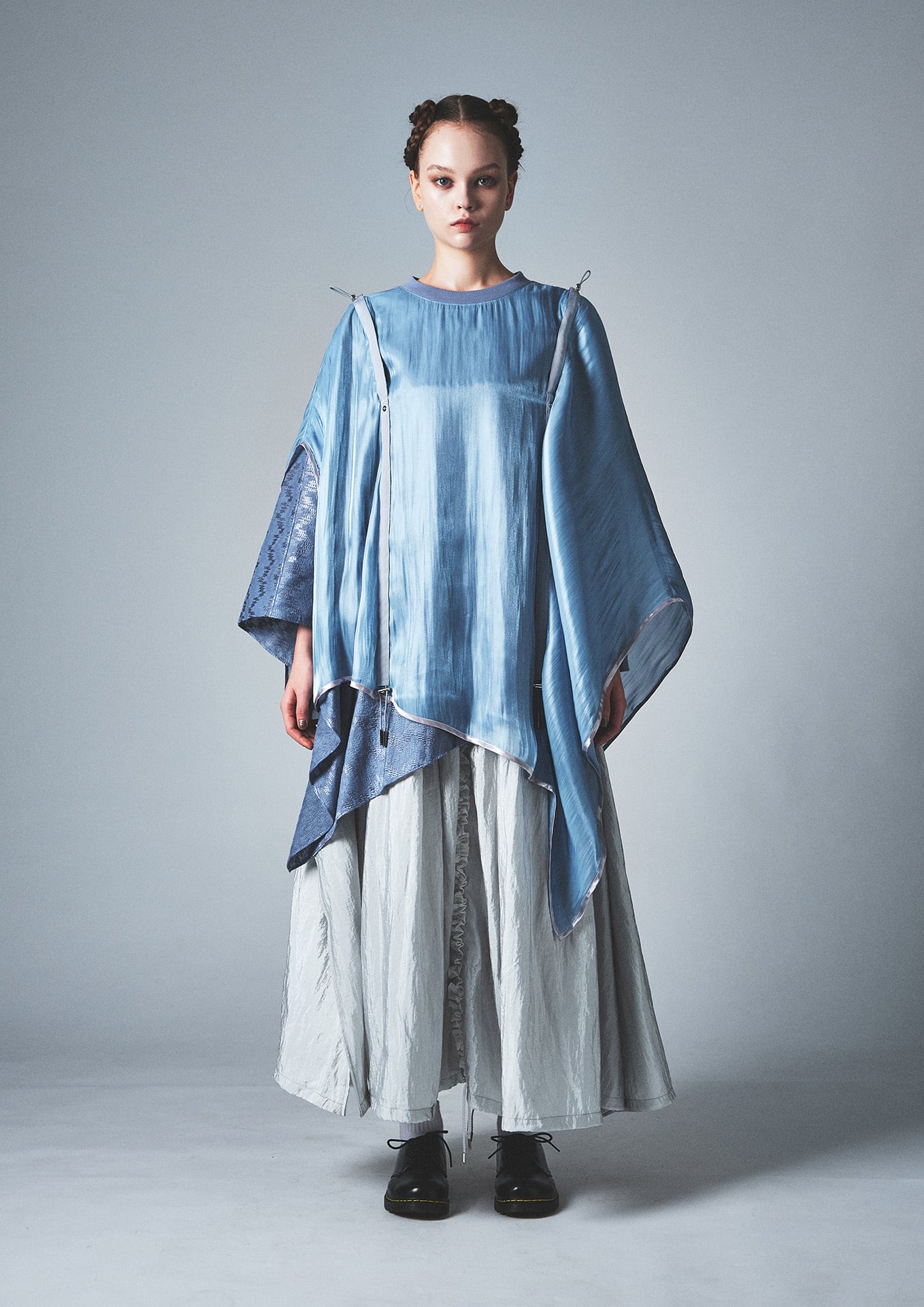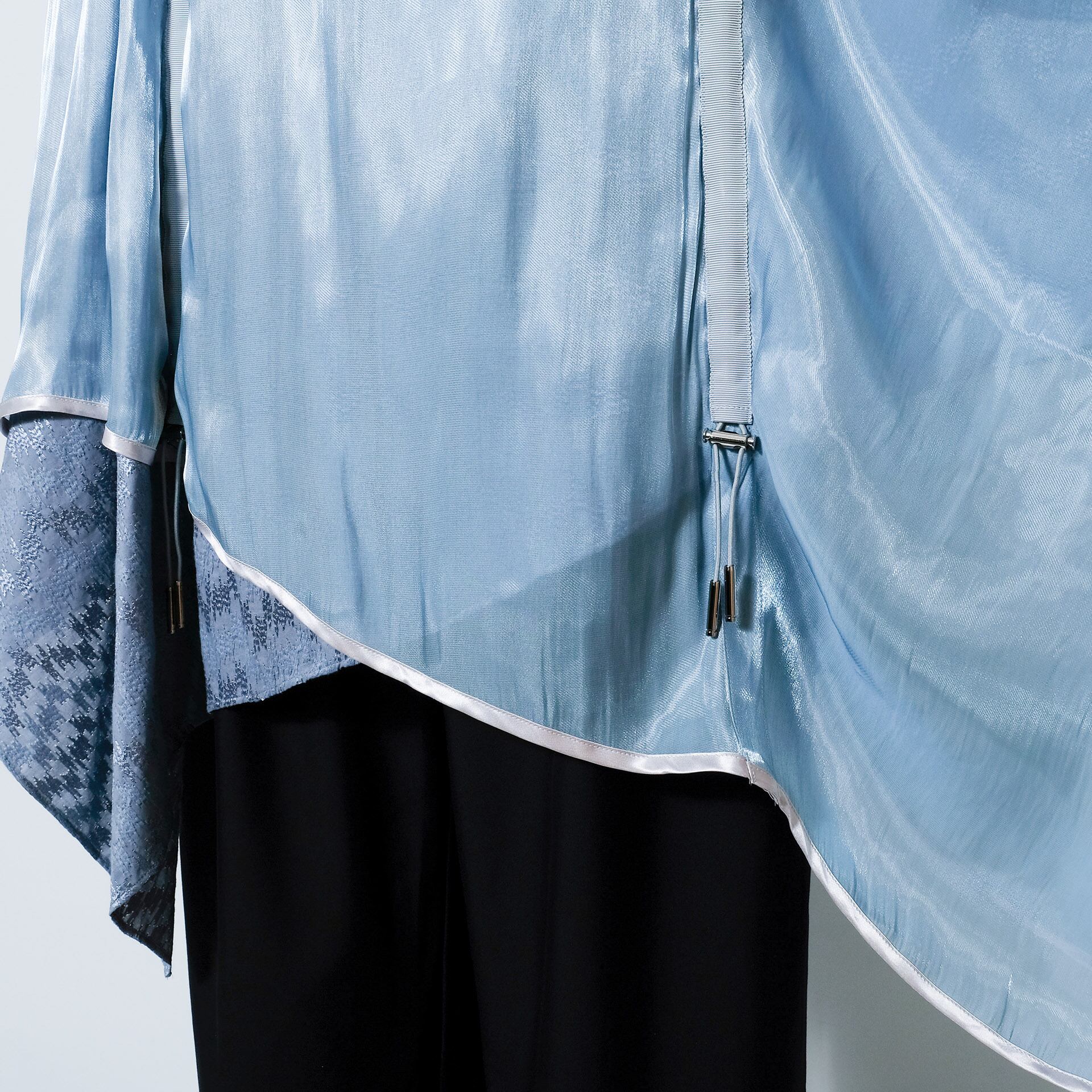 ウエットな艶のサテンオーガンジーとギザギザ状の刺繍が施されたローンを絶妙に掛け合わせた、ケープ状のチュニックです。