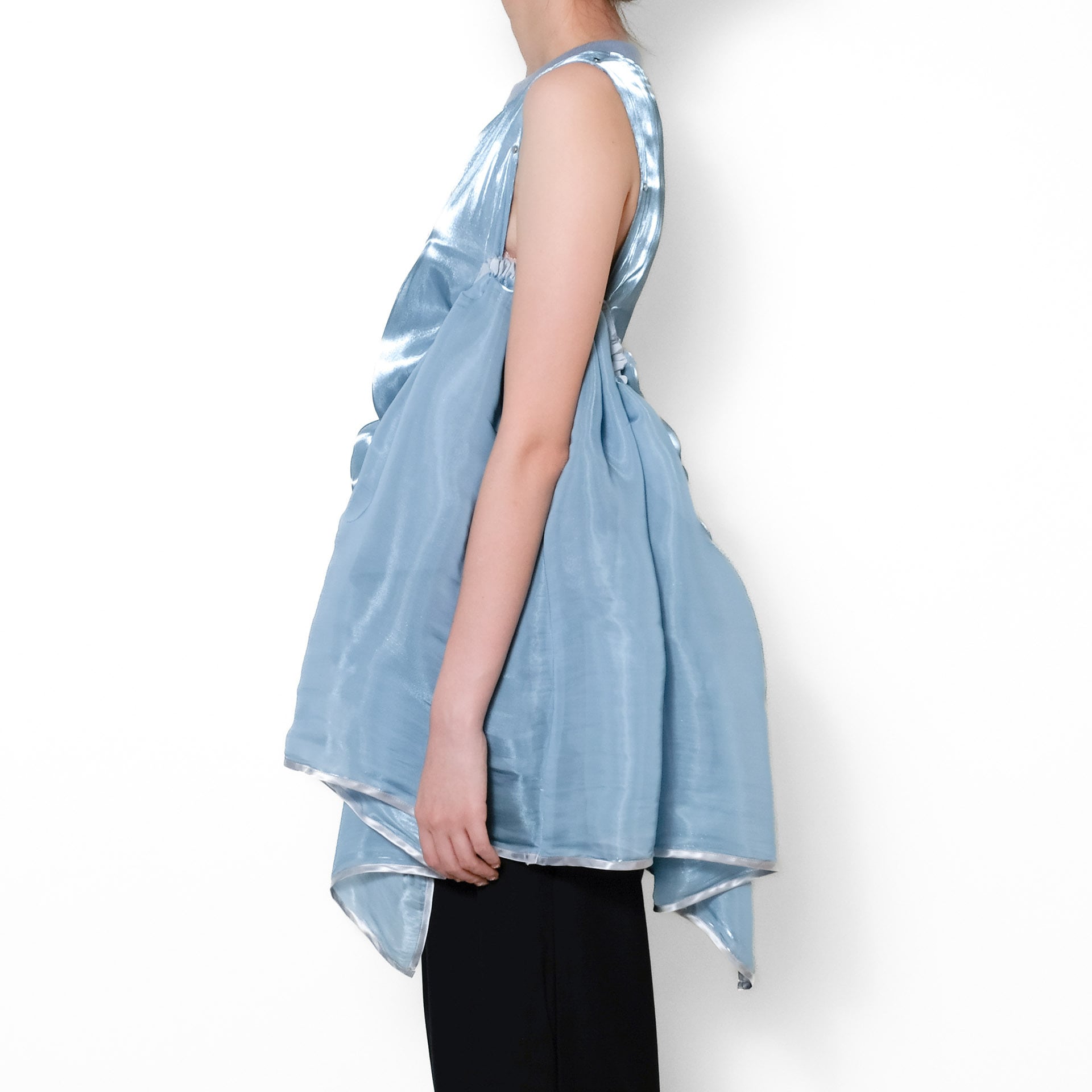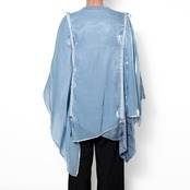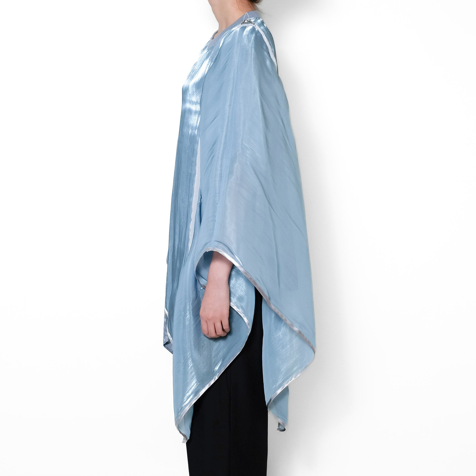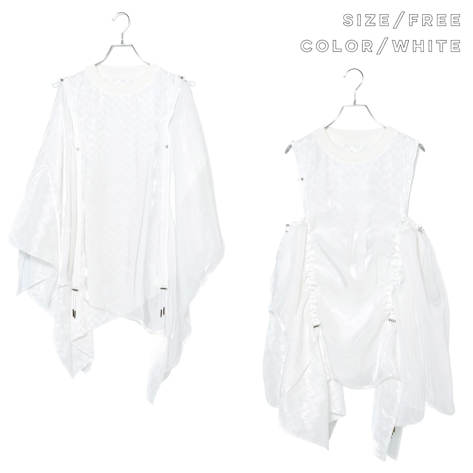 ウエットな艶のサテンオーガンジーとギザギザ状の刺繍が施されたローンを絶妙に掛け合わせた、ケープ状のチュニックです。
