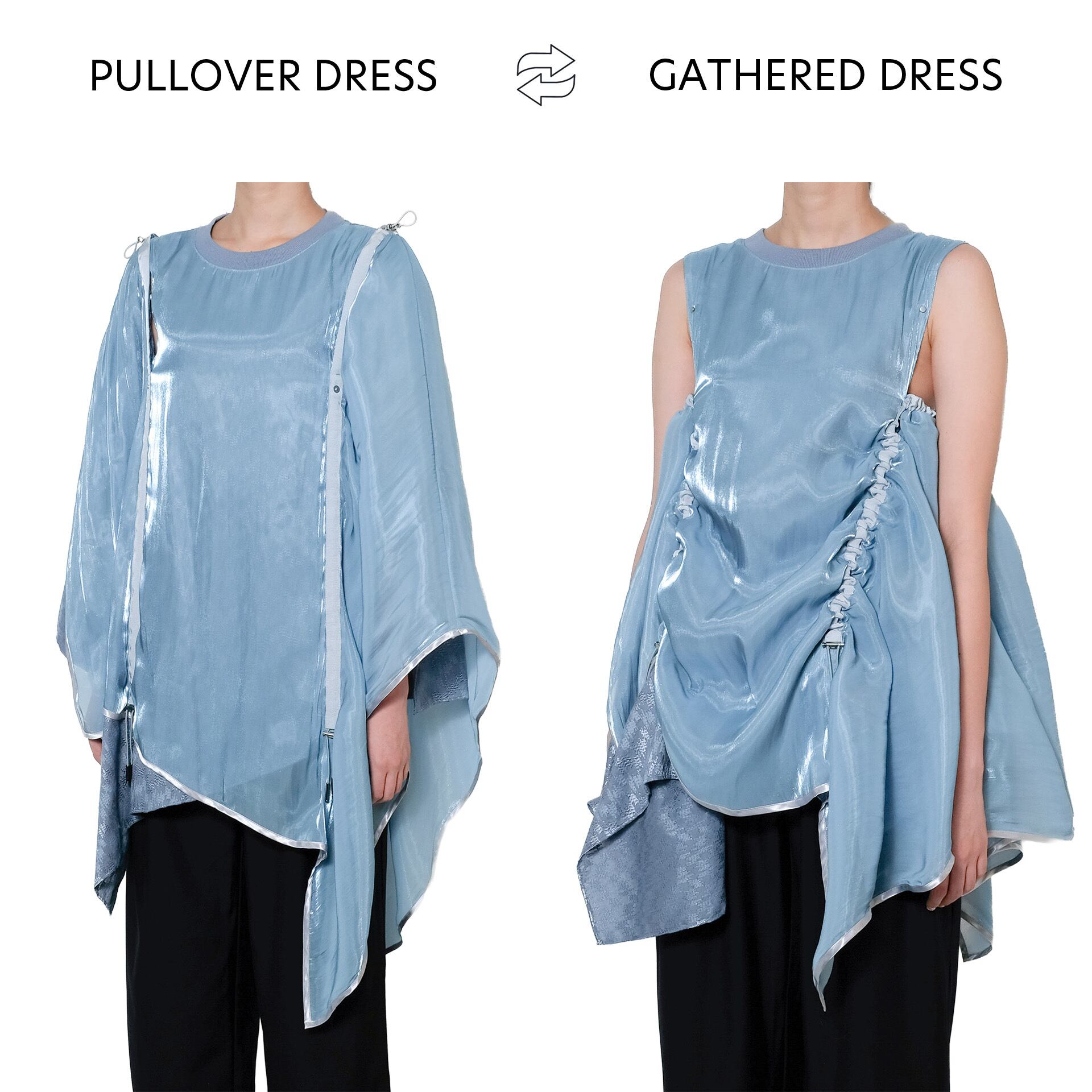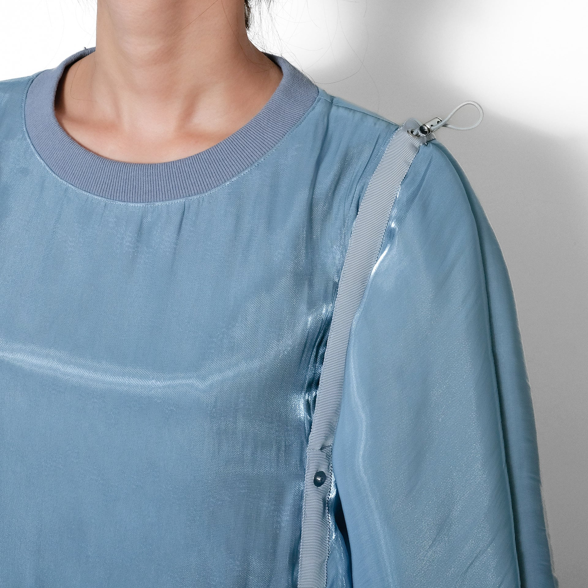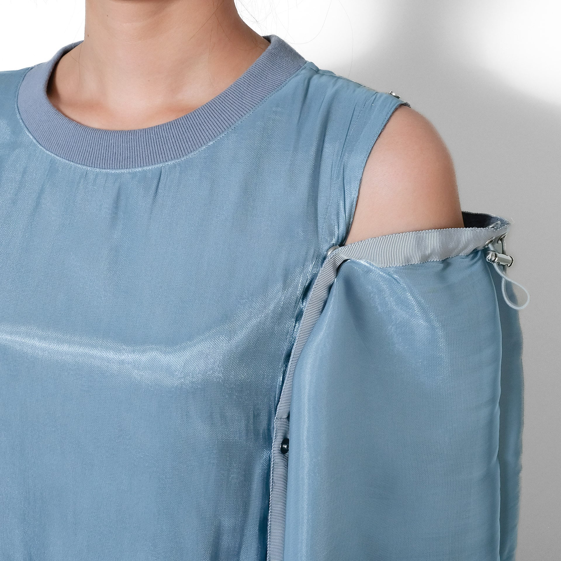 肩に配置したドットボタンを外し、袖のゴムスピンドルを絞ることで、一瞬でノースリーブスタイルに変身。