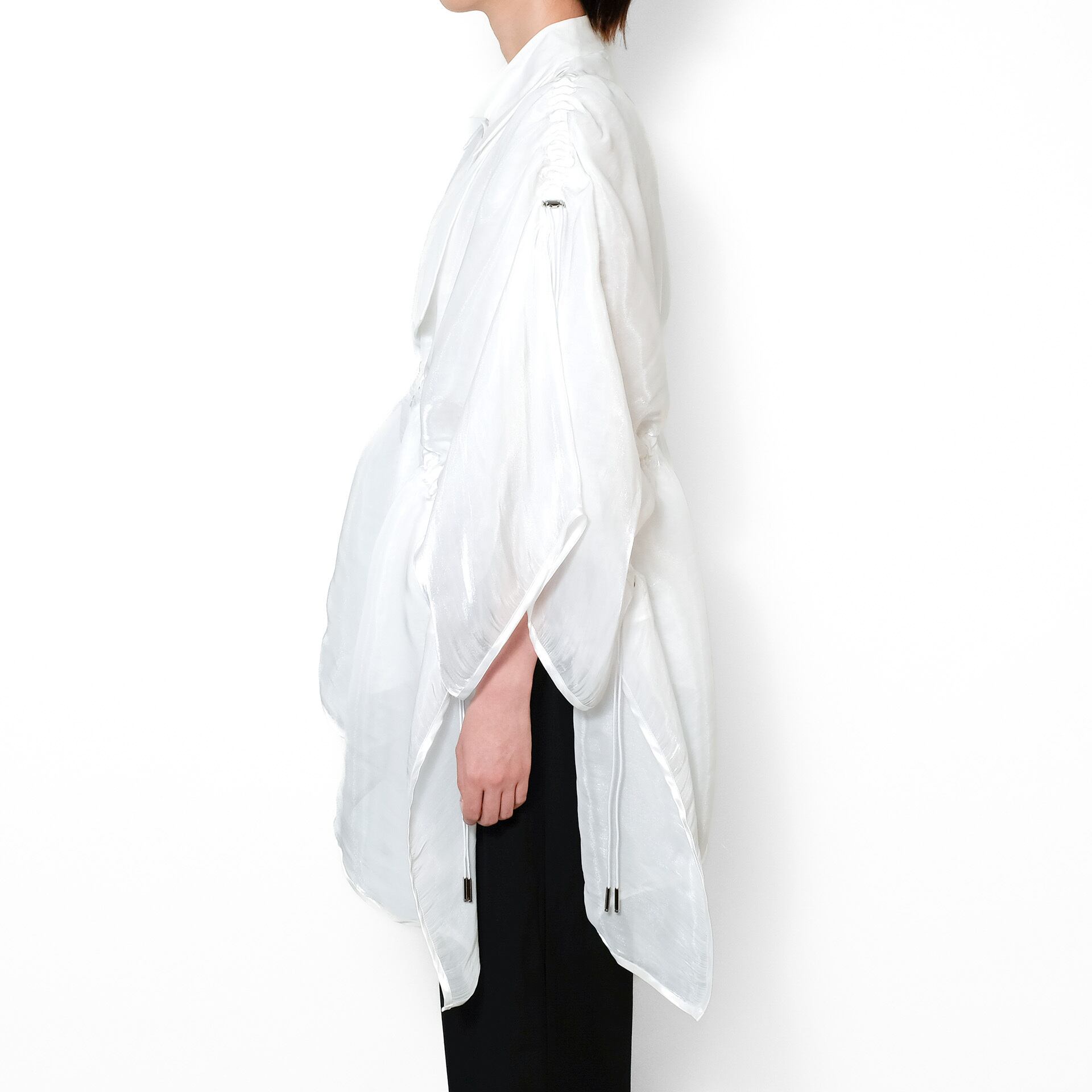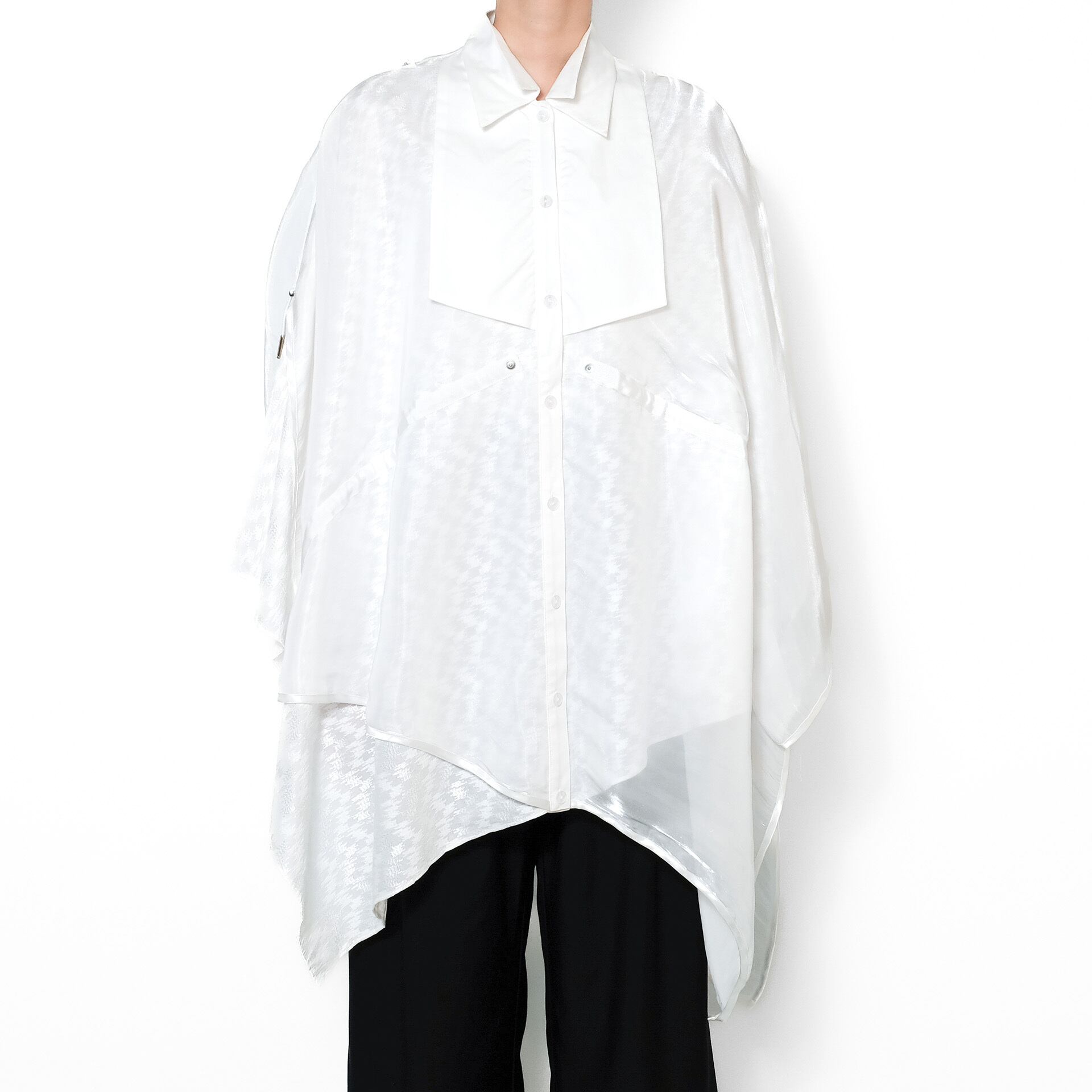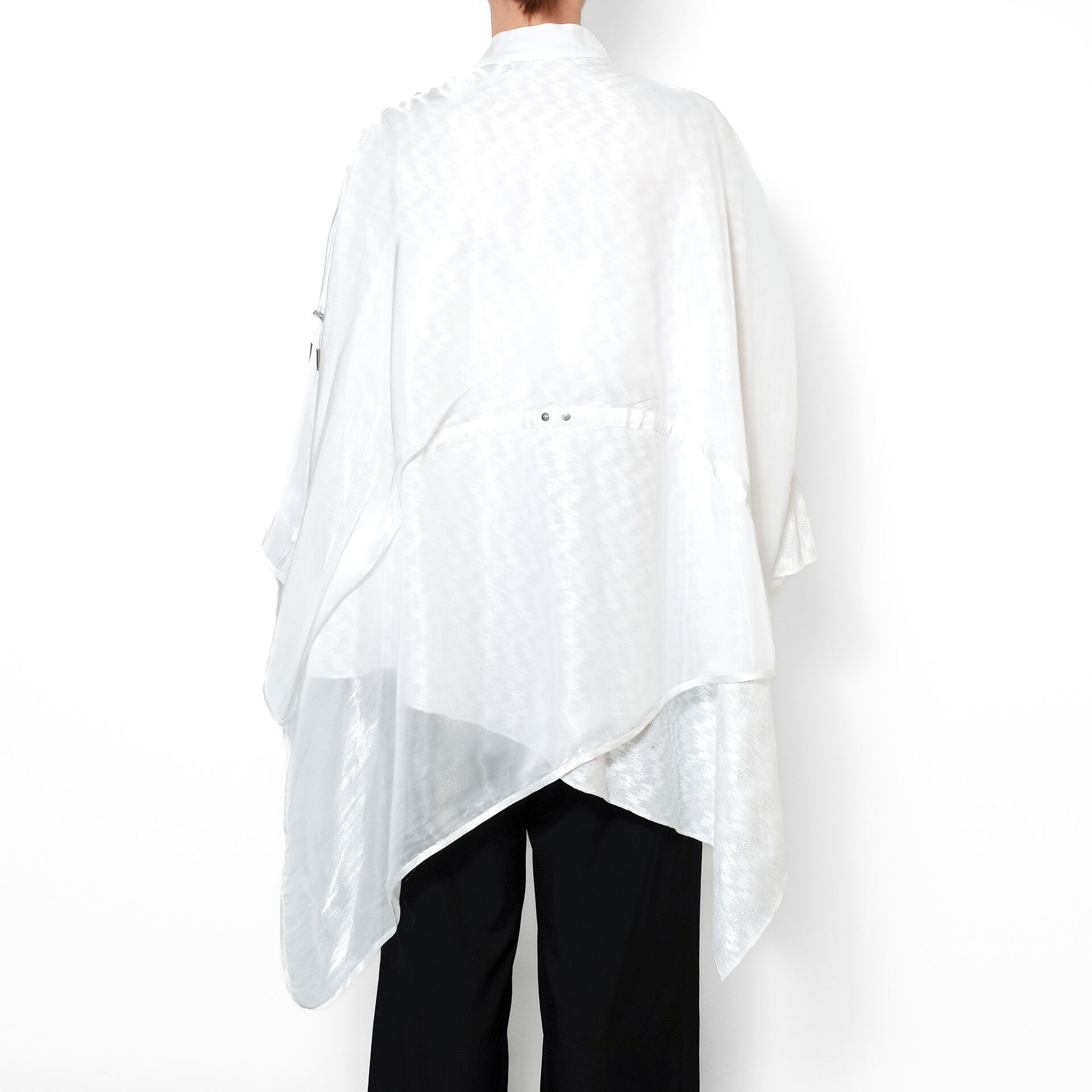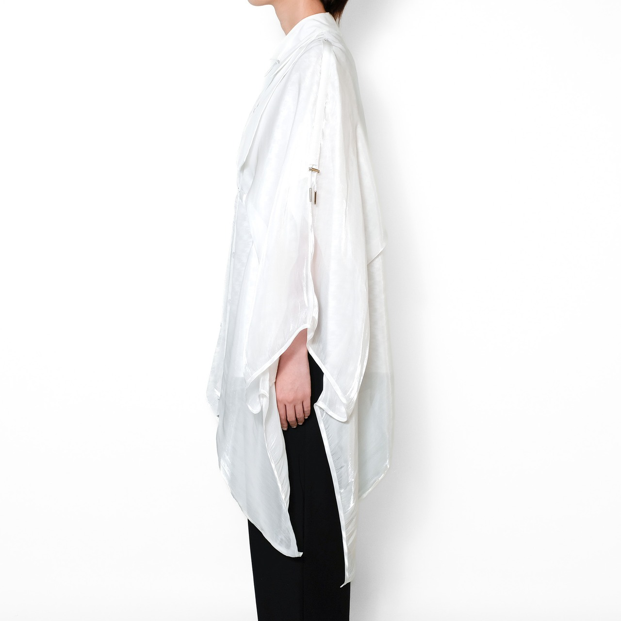 ウエットな艶のサテンオーガンジーとギザギザ状の刺繍が施されたローンを絶妙に掛け合わせた、ケープ状のロングシャツです。