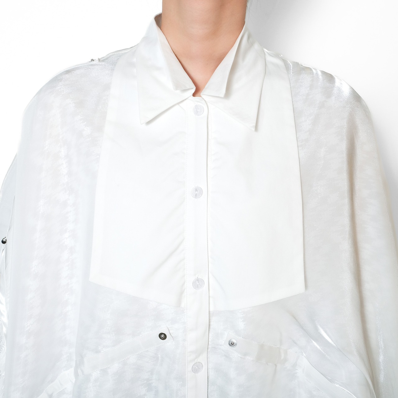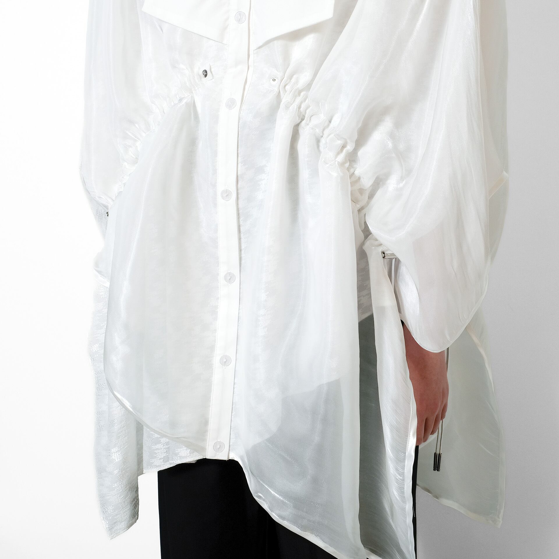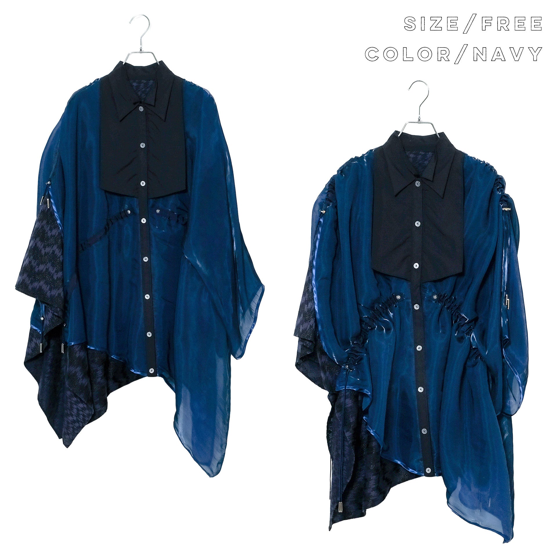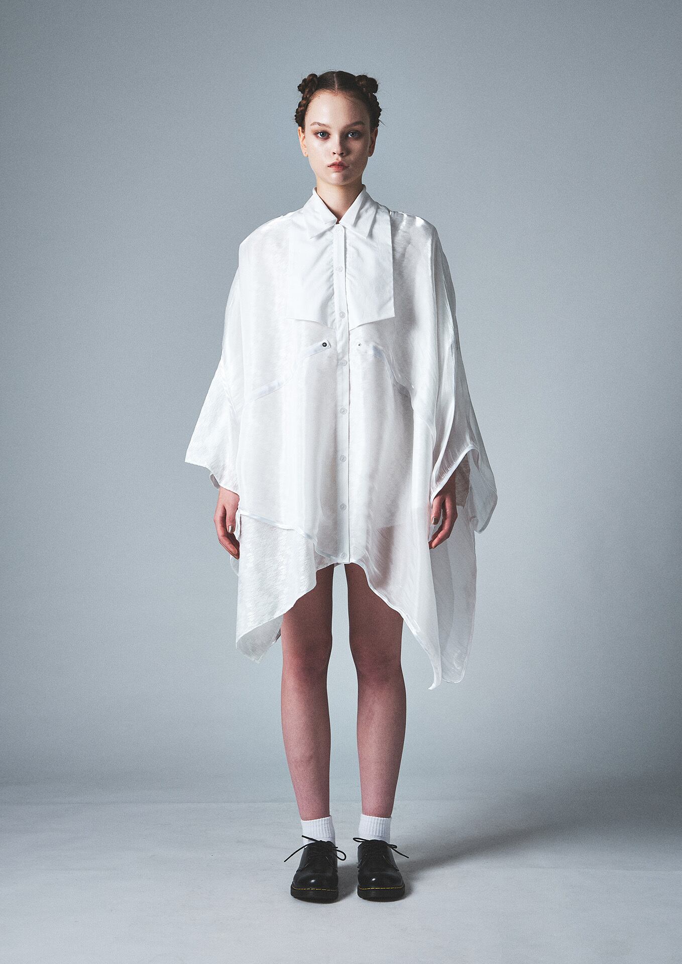 ウエットな艶のサテンオーガンジーとギザギザ状の刺繍が施されたローンを絶妙に掛け合わせた、ケープ状のロングシャツです。