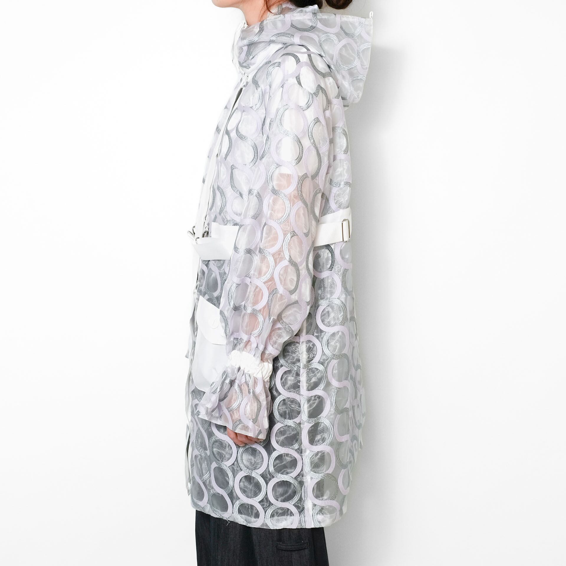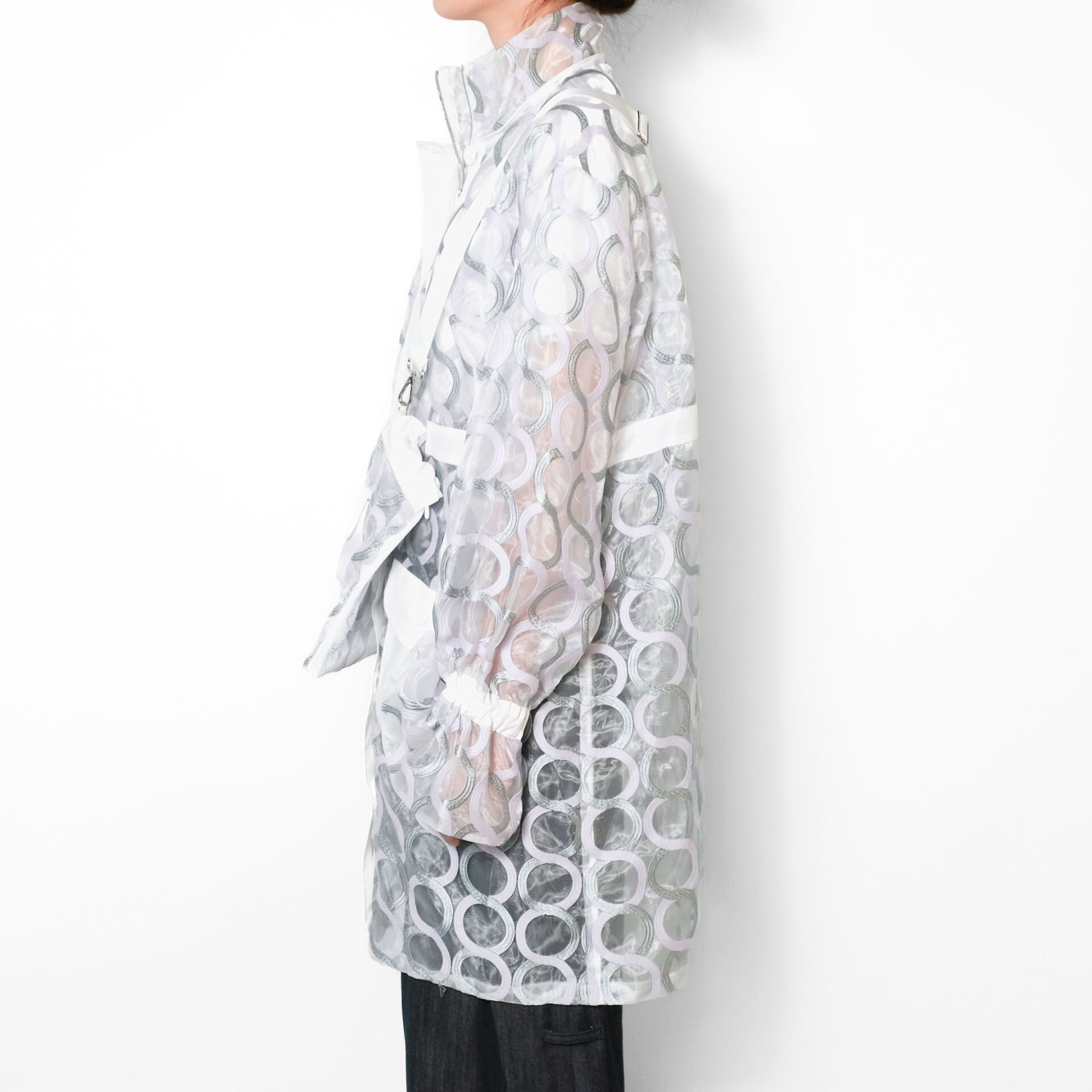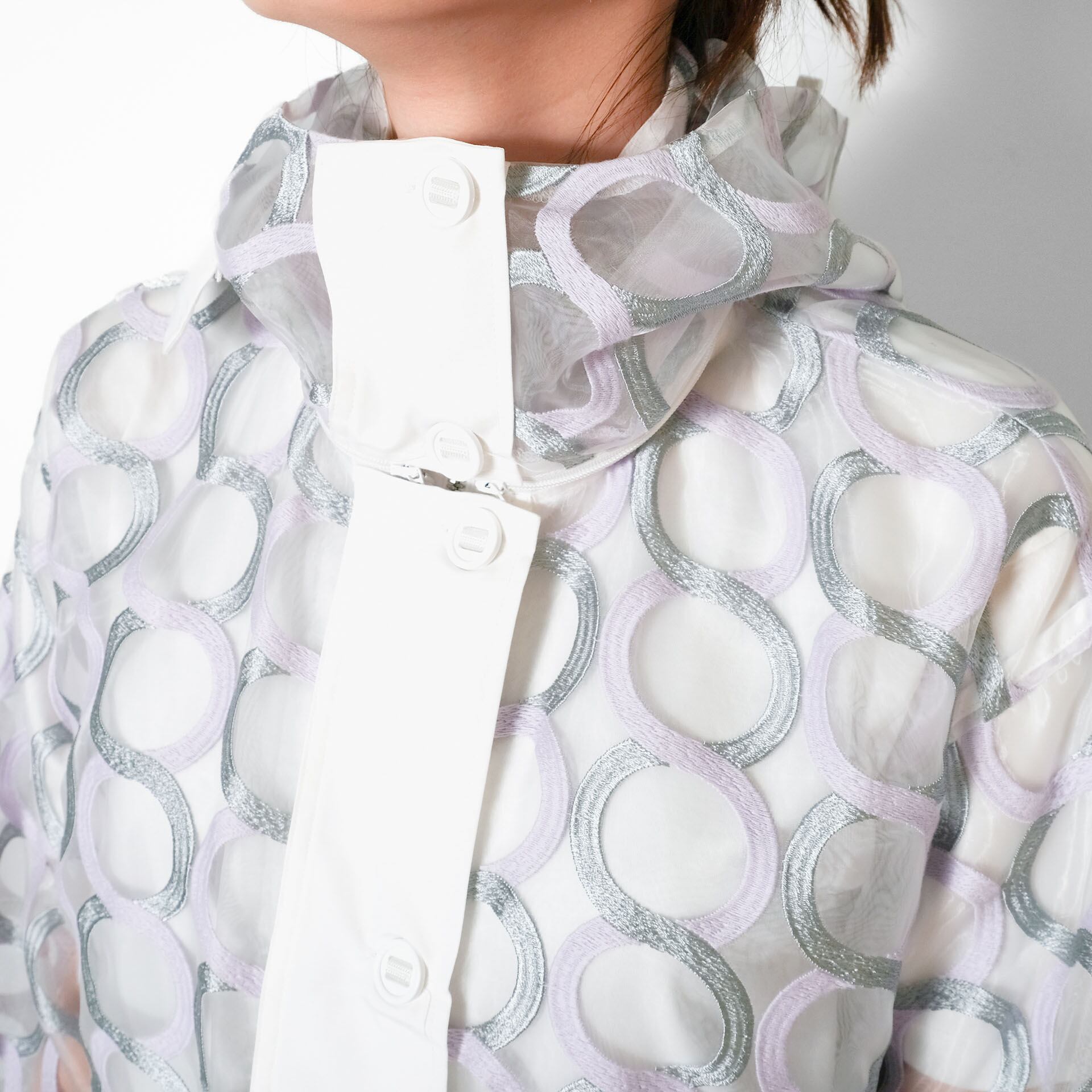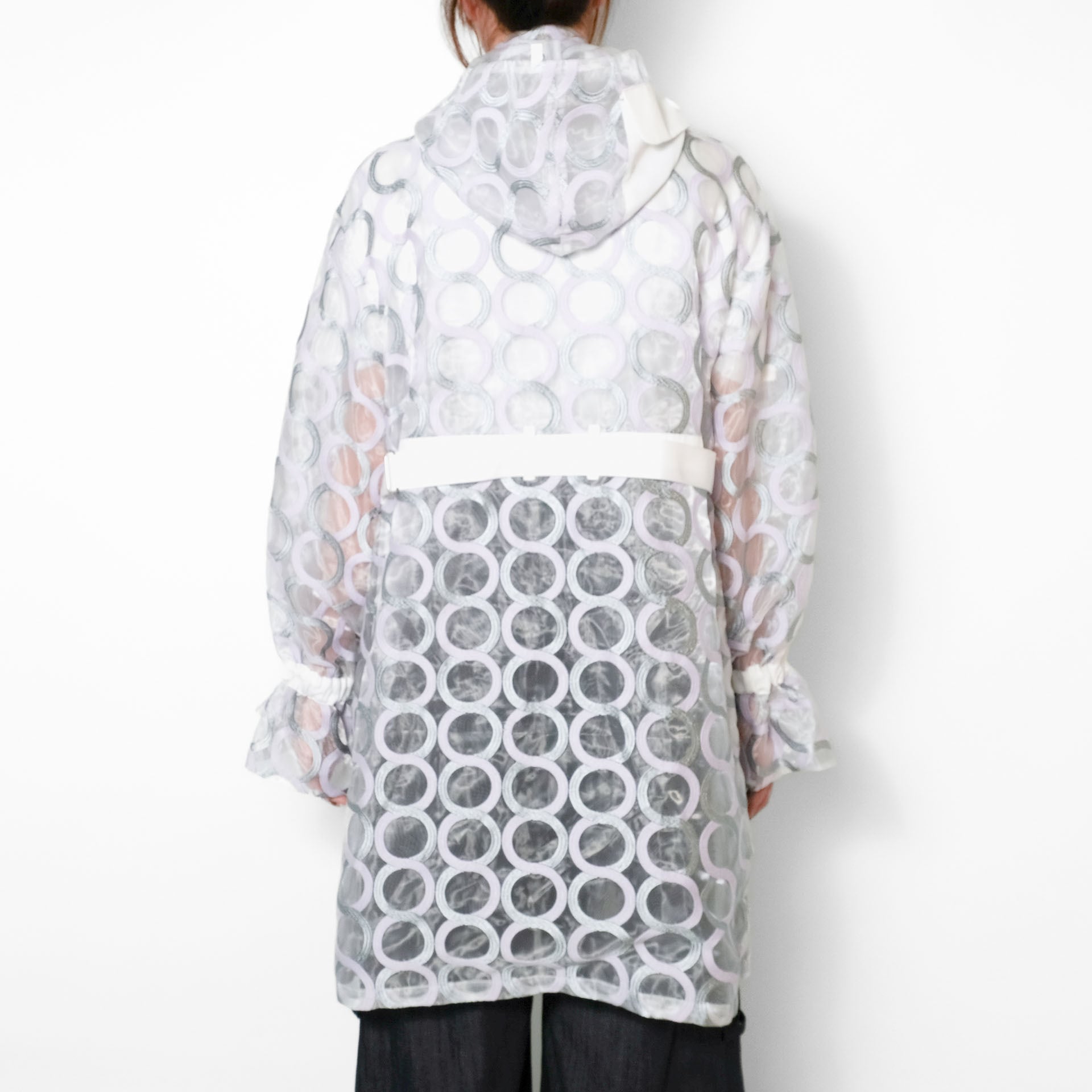 オーガンジーに2色のウェーブ状刺繍を施したオリジナルファブリックを使用した、シアー感が際立つフーデッドモッズコート。
