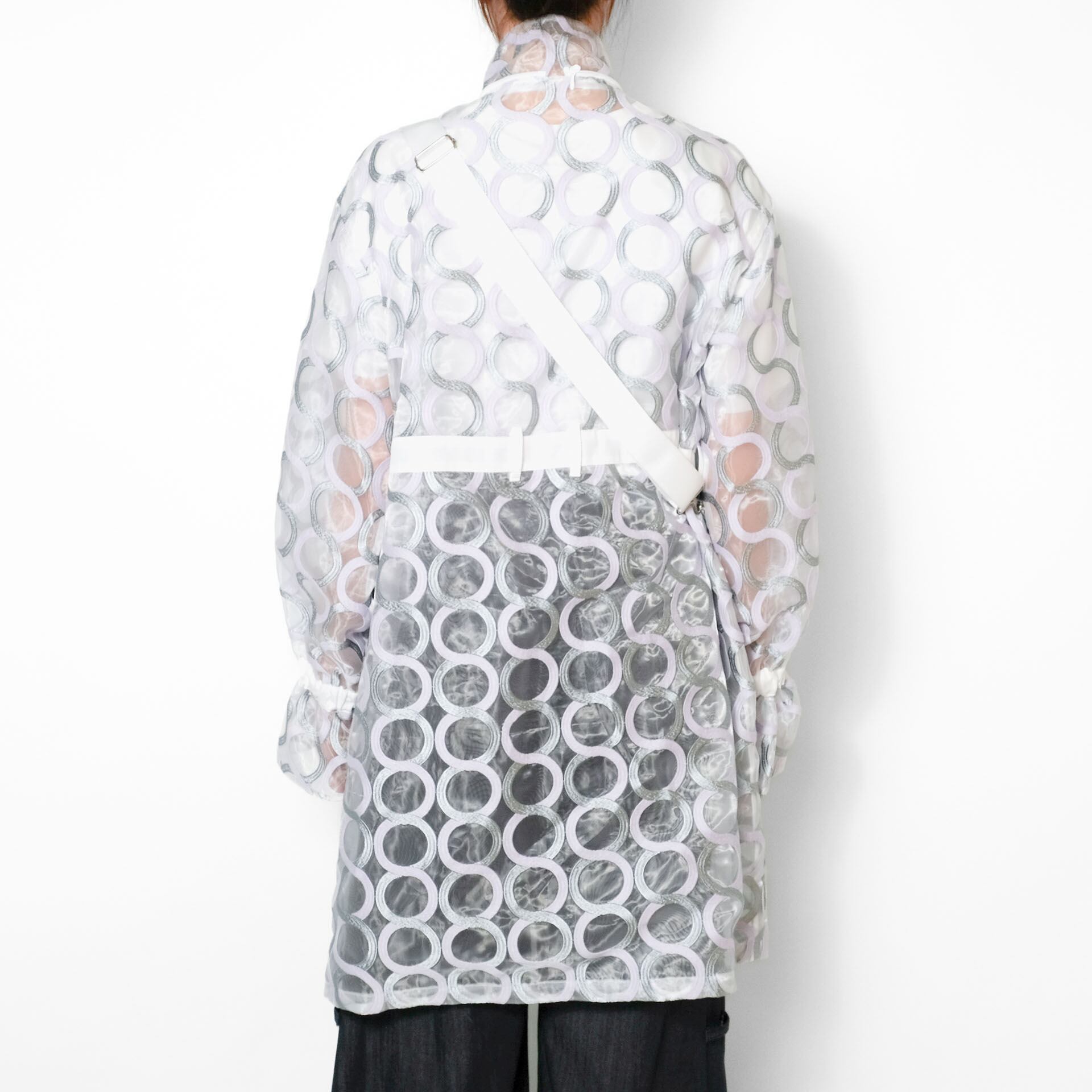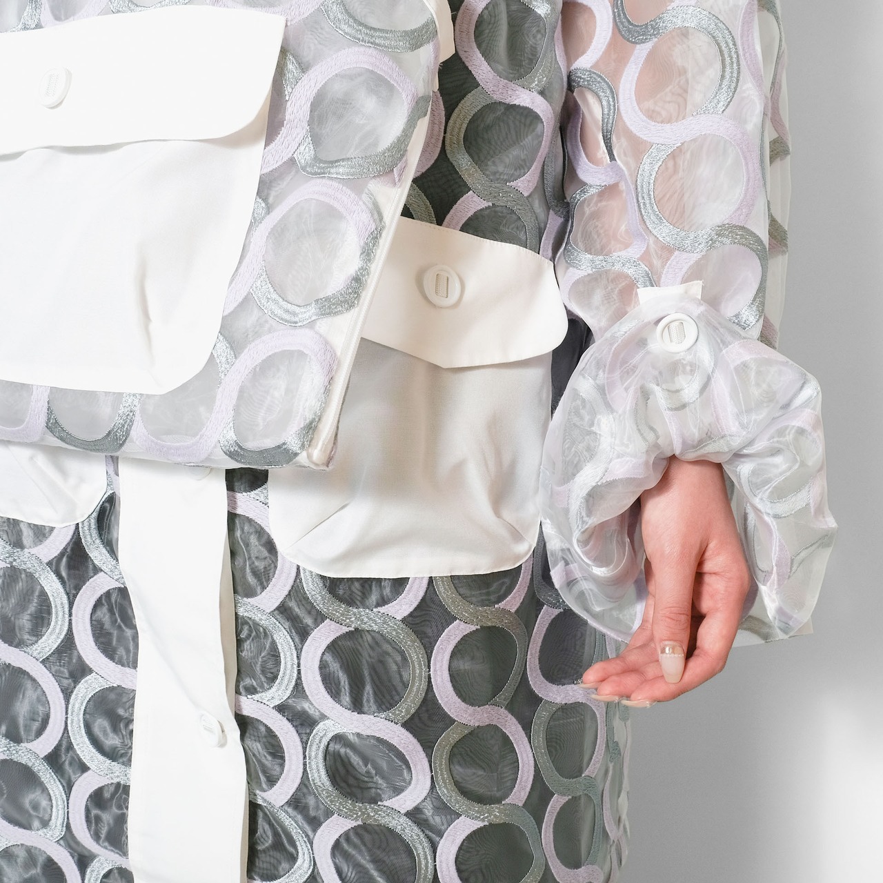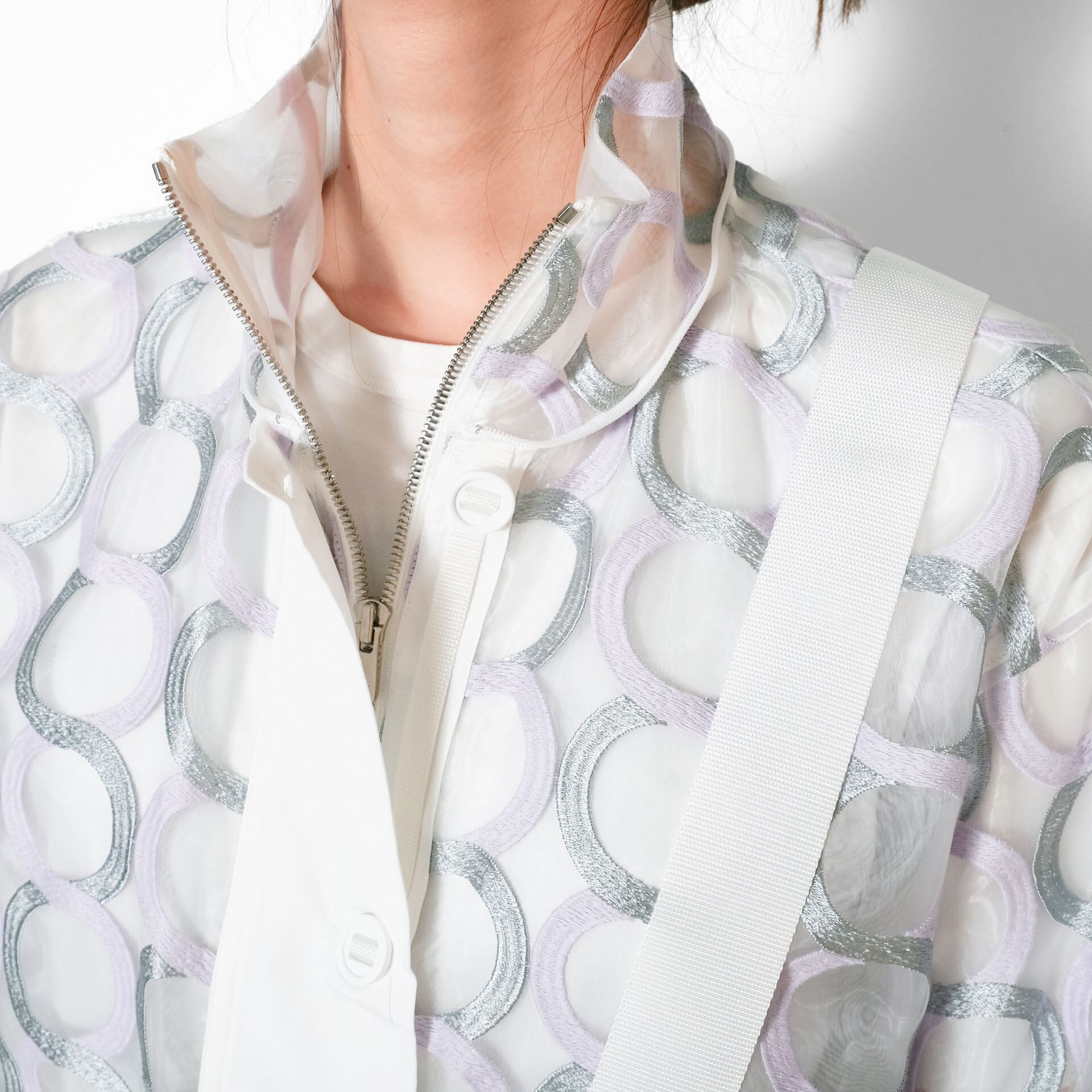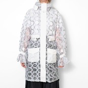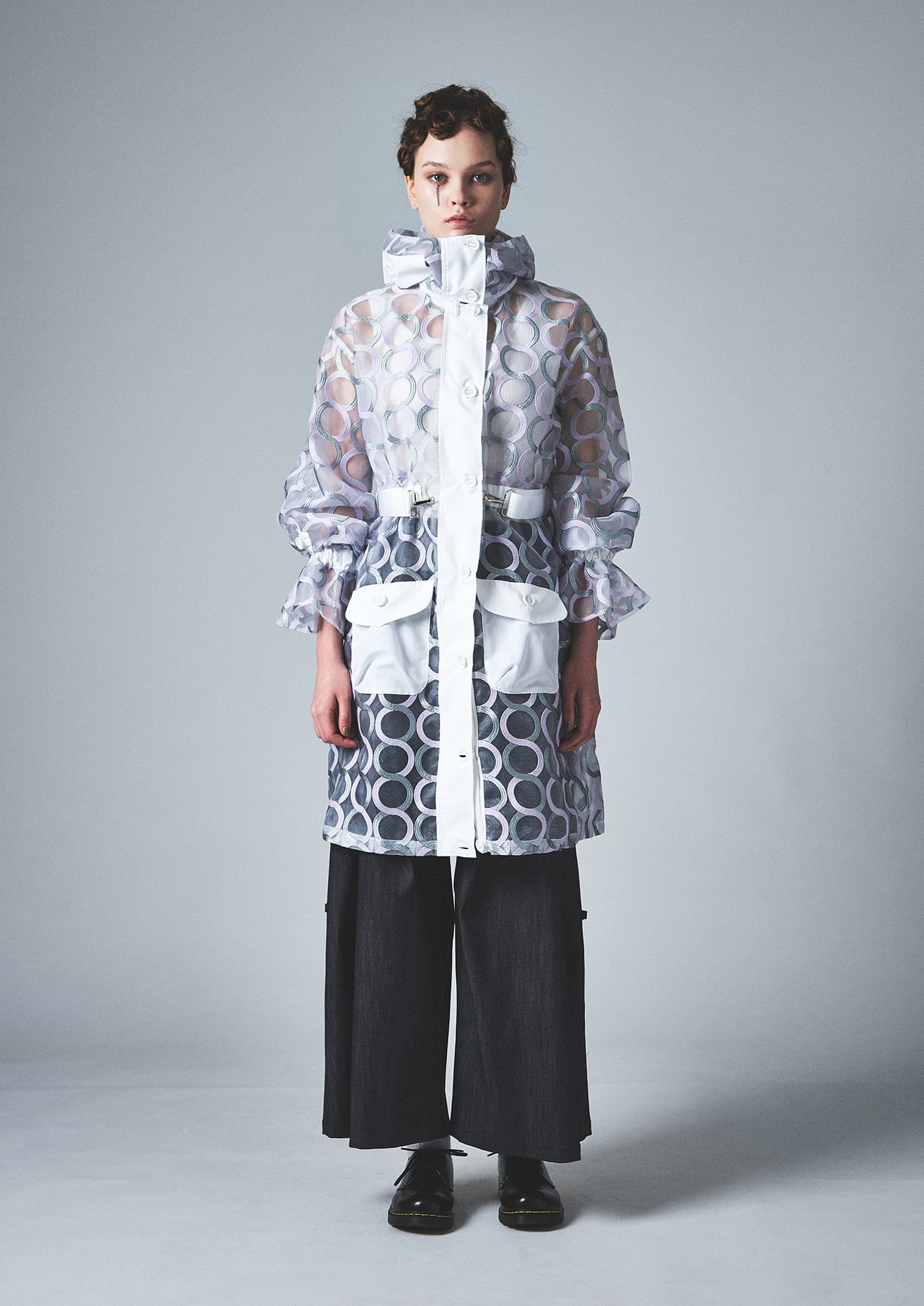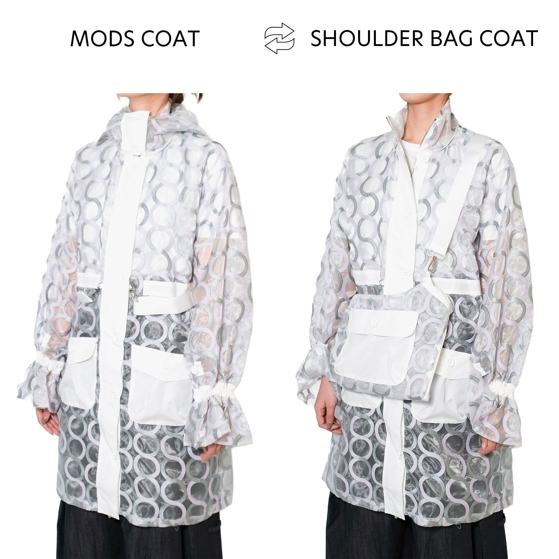 オーガンジーに2色のウェーブ状刺繍を施したオリジナルファブリックを使用した、シアー感が際立つフーデッドモッズコート。