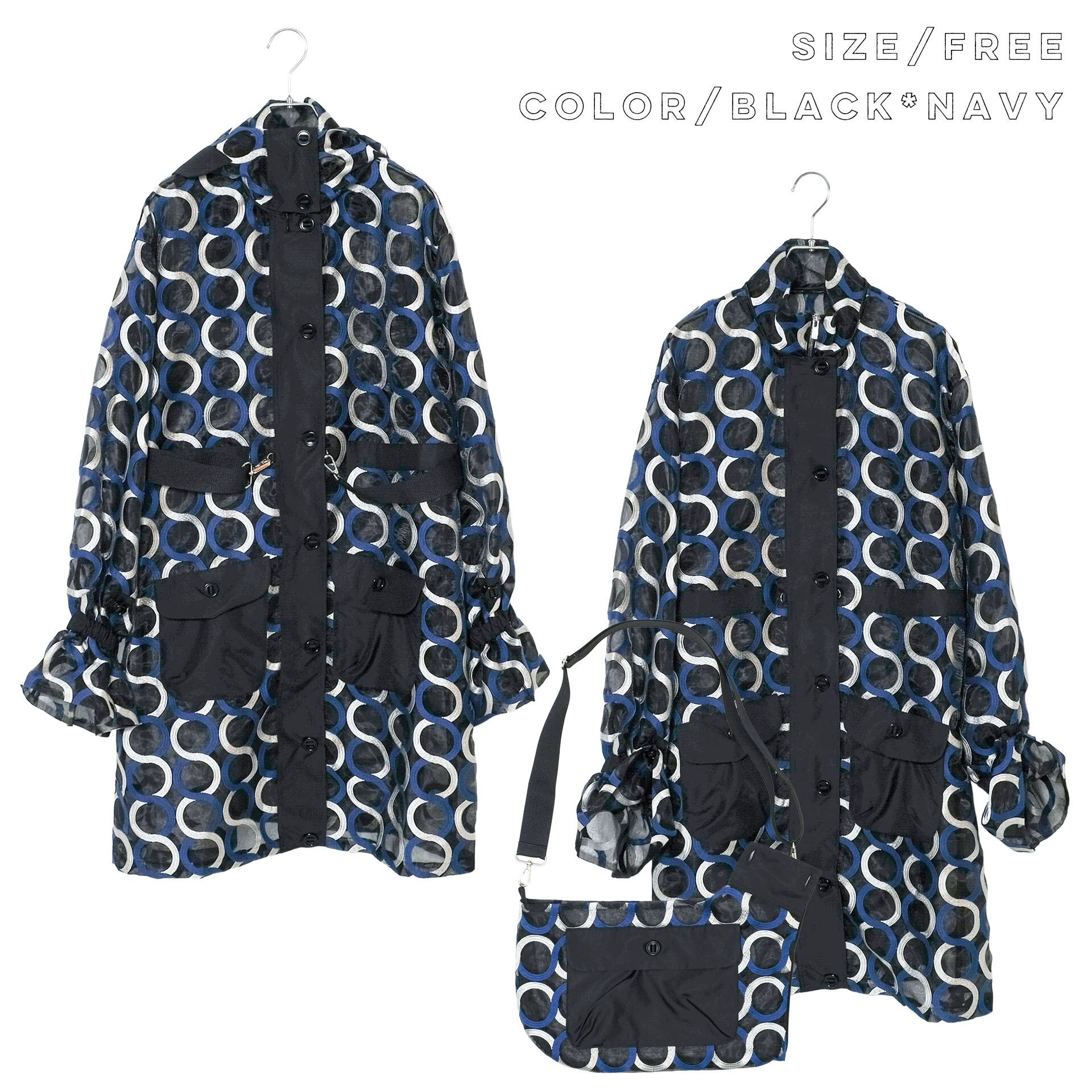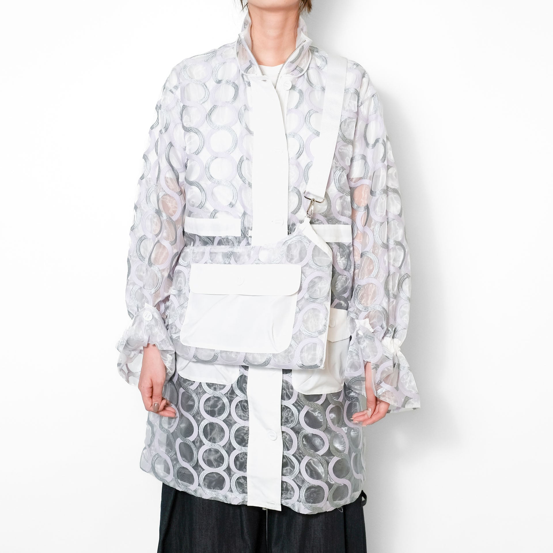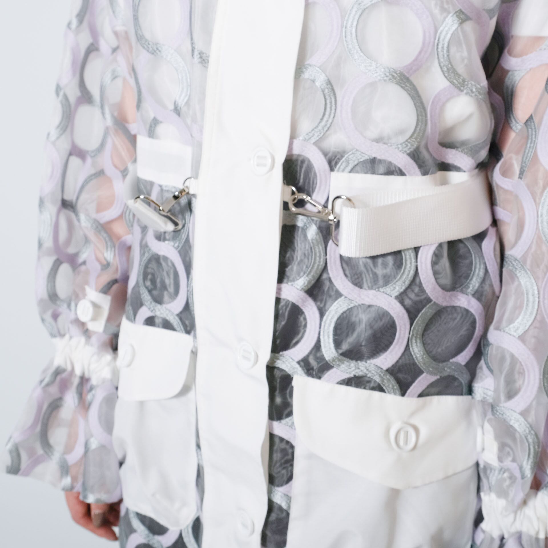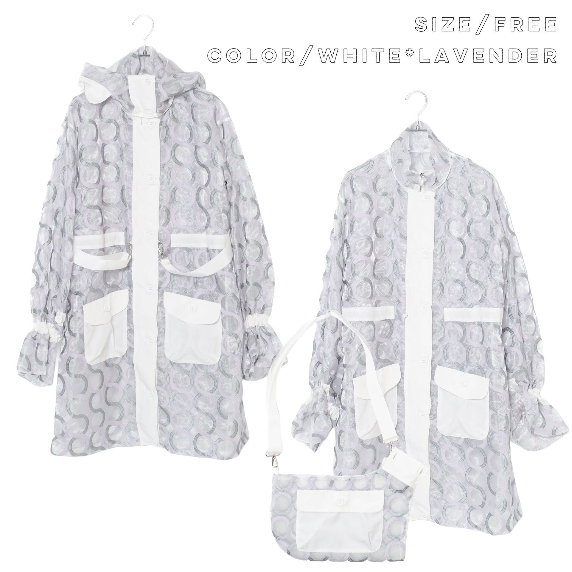 オーガンジーに2色のウェーブ状刺繍を施したオリジナルファブリックを使用した、シアー感が際立つフーデッドモッズコート。