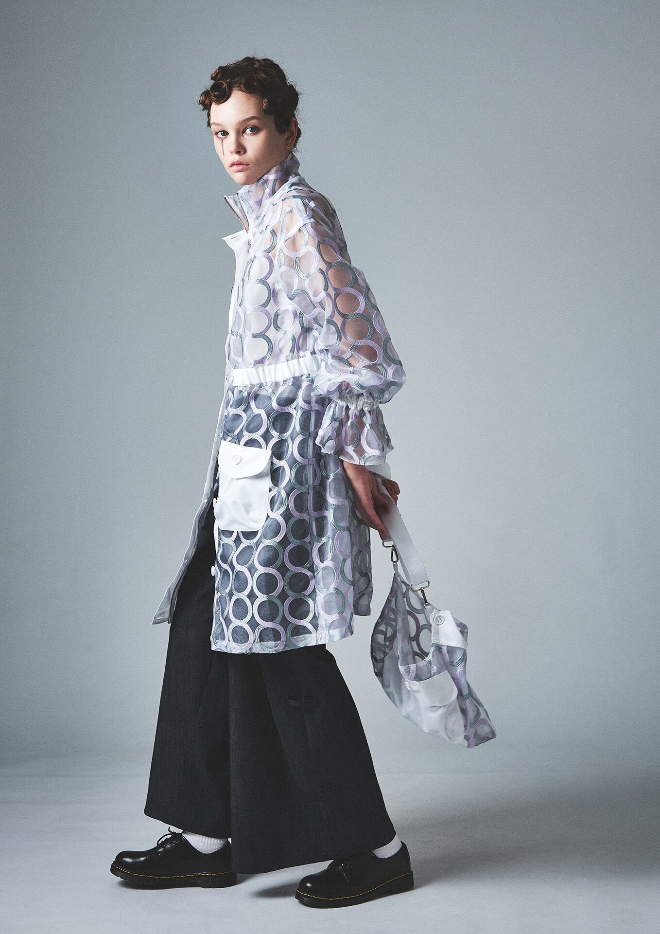 代表的なミリタリーアイテムであるモッズコートを、透け感とインパクトのある素材で再構築し、洗練された印象に仕上げました。