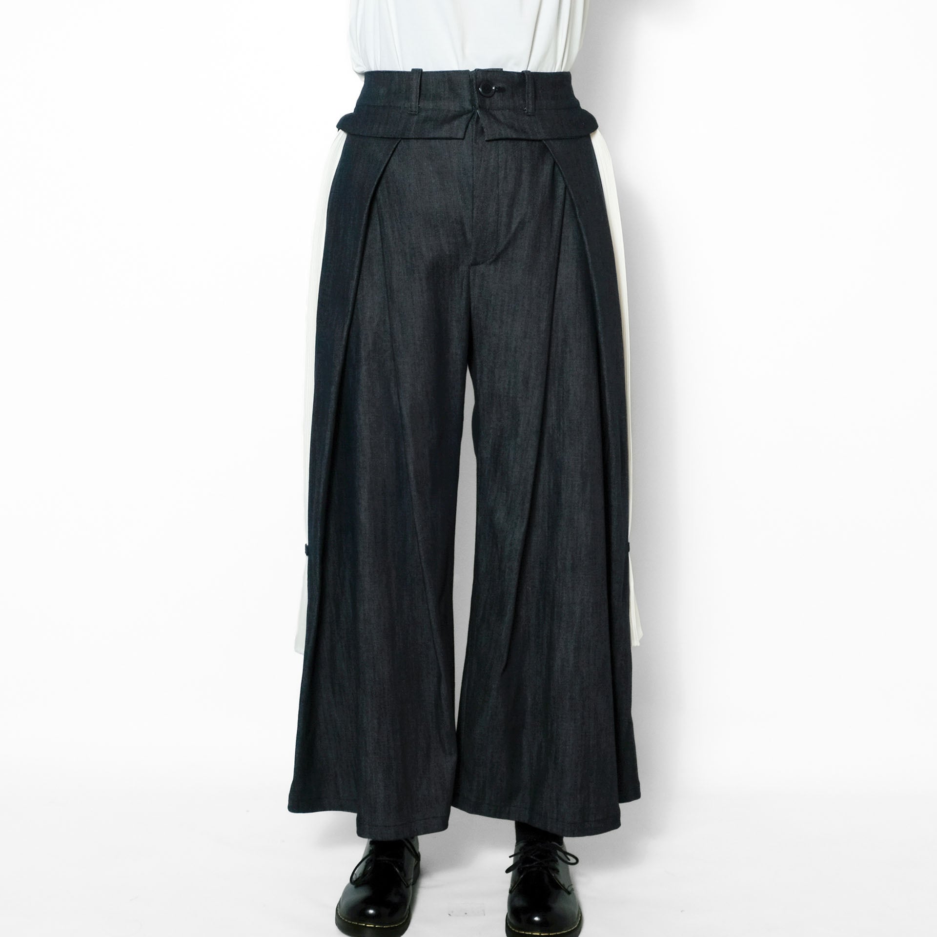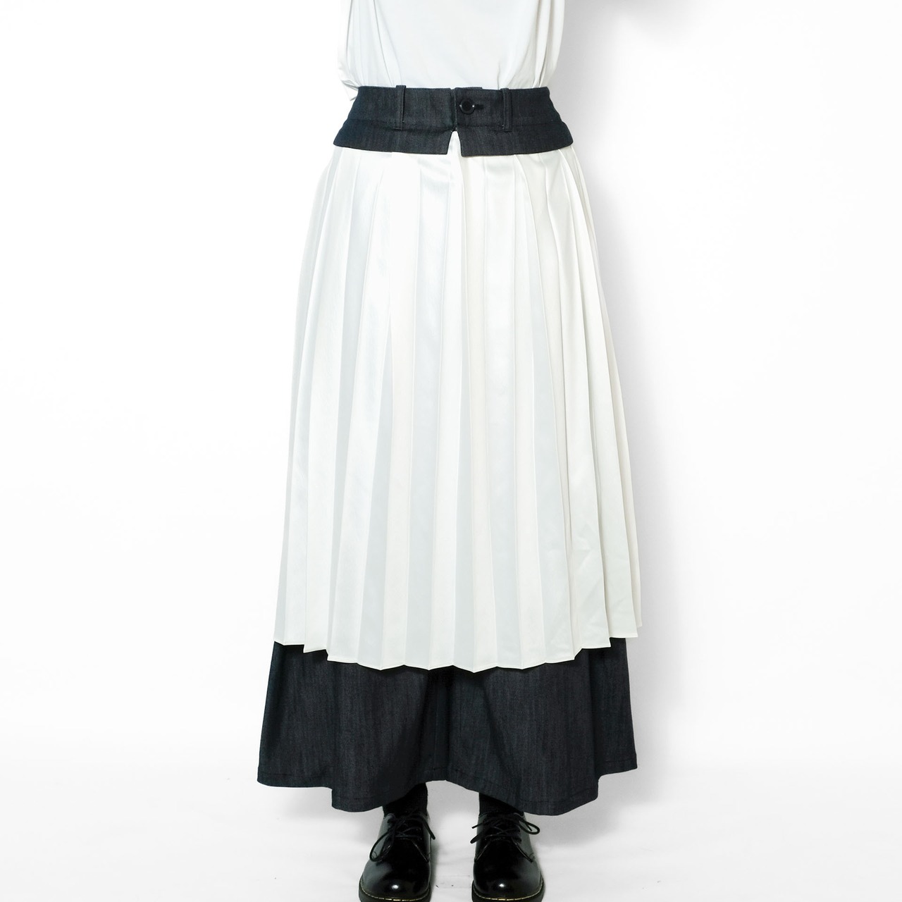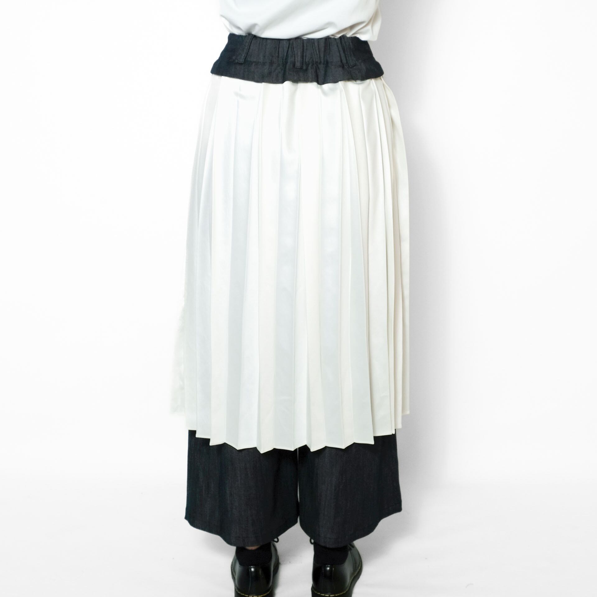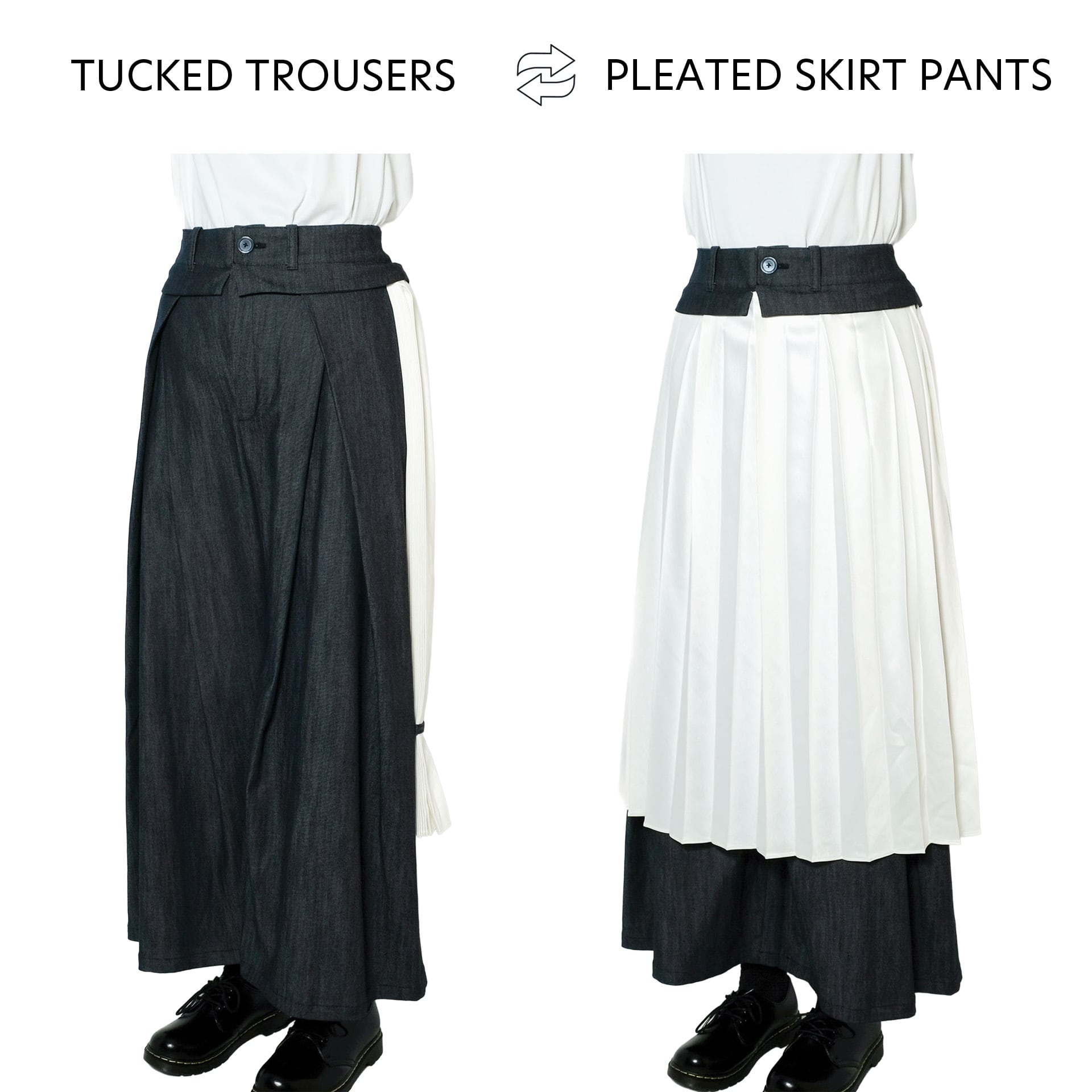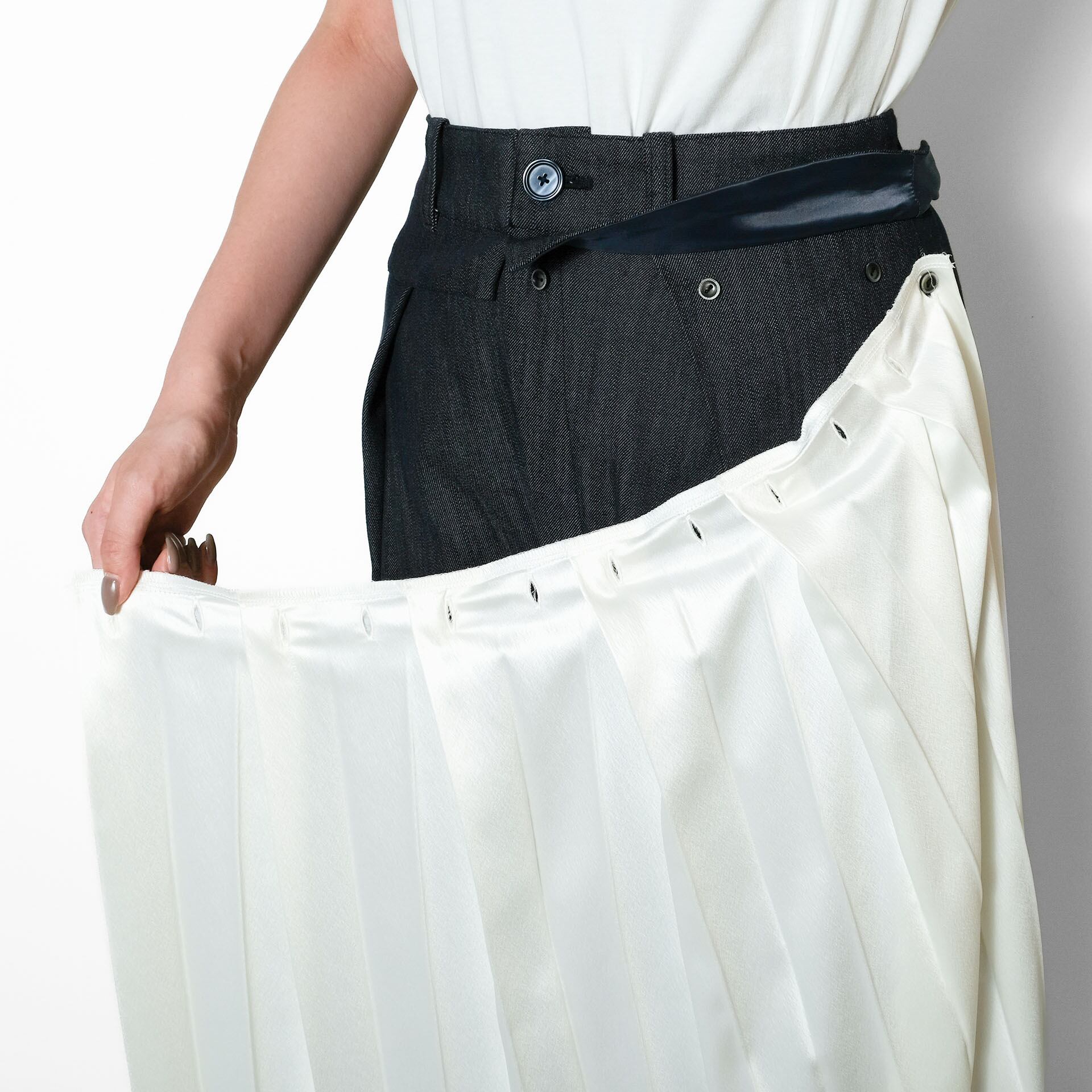 さらに、取り外し可能なプリーツ布を装着することで、スカートパンツへと変形可能。ドッキング構造による変形性が、スタイルにクリエイティブな広がりをもたらします。