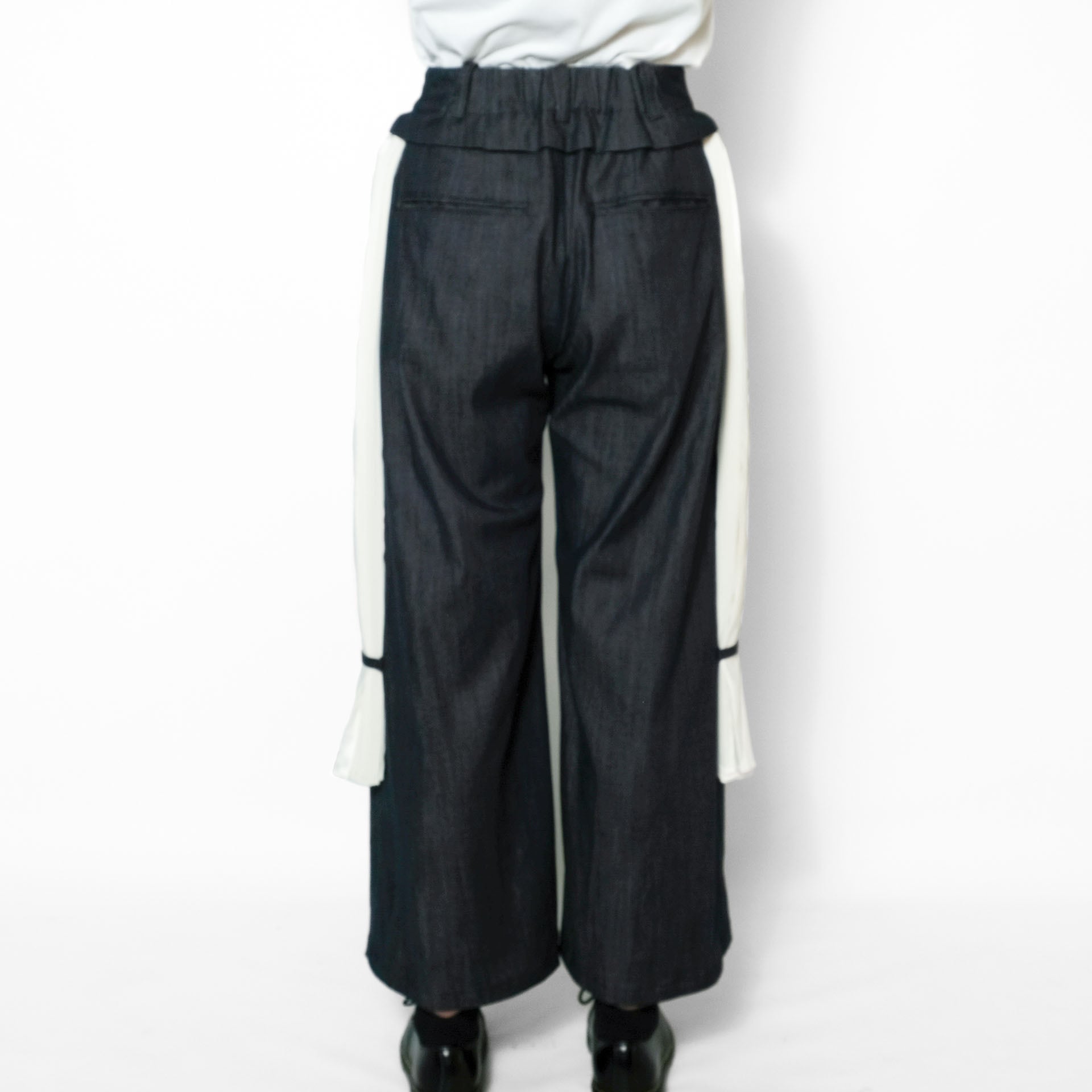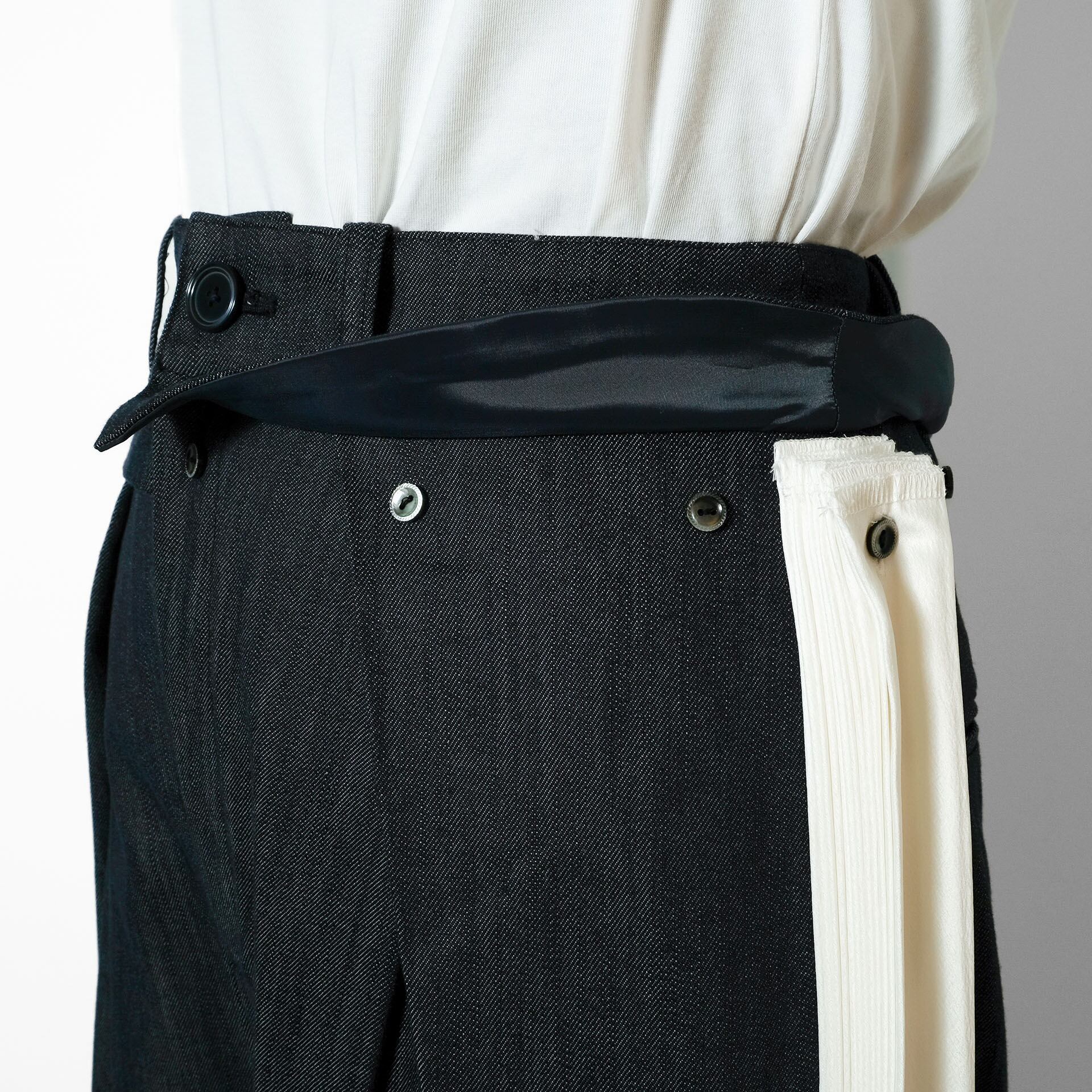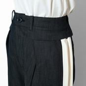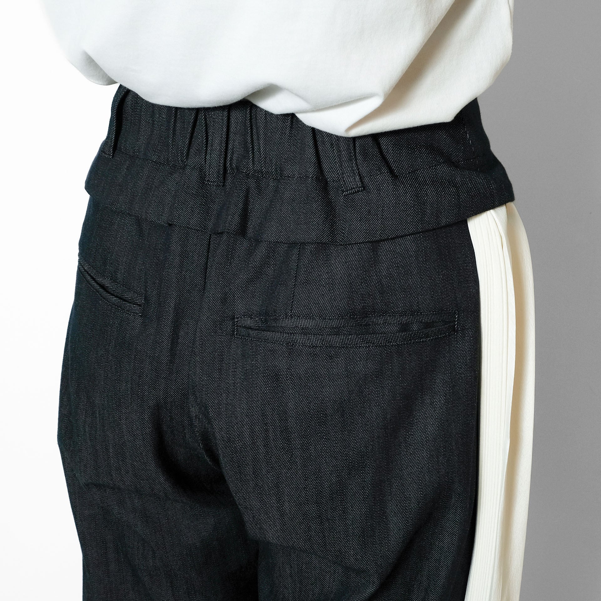 柔らかな風合いのリヨセルデニムと、レザーのような光沢と質感を持つサテンを掛け合わせたタックパンツ。