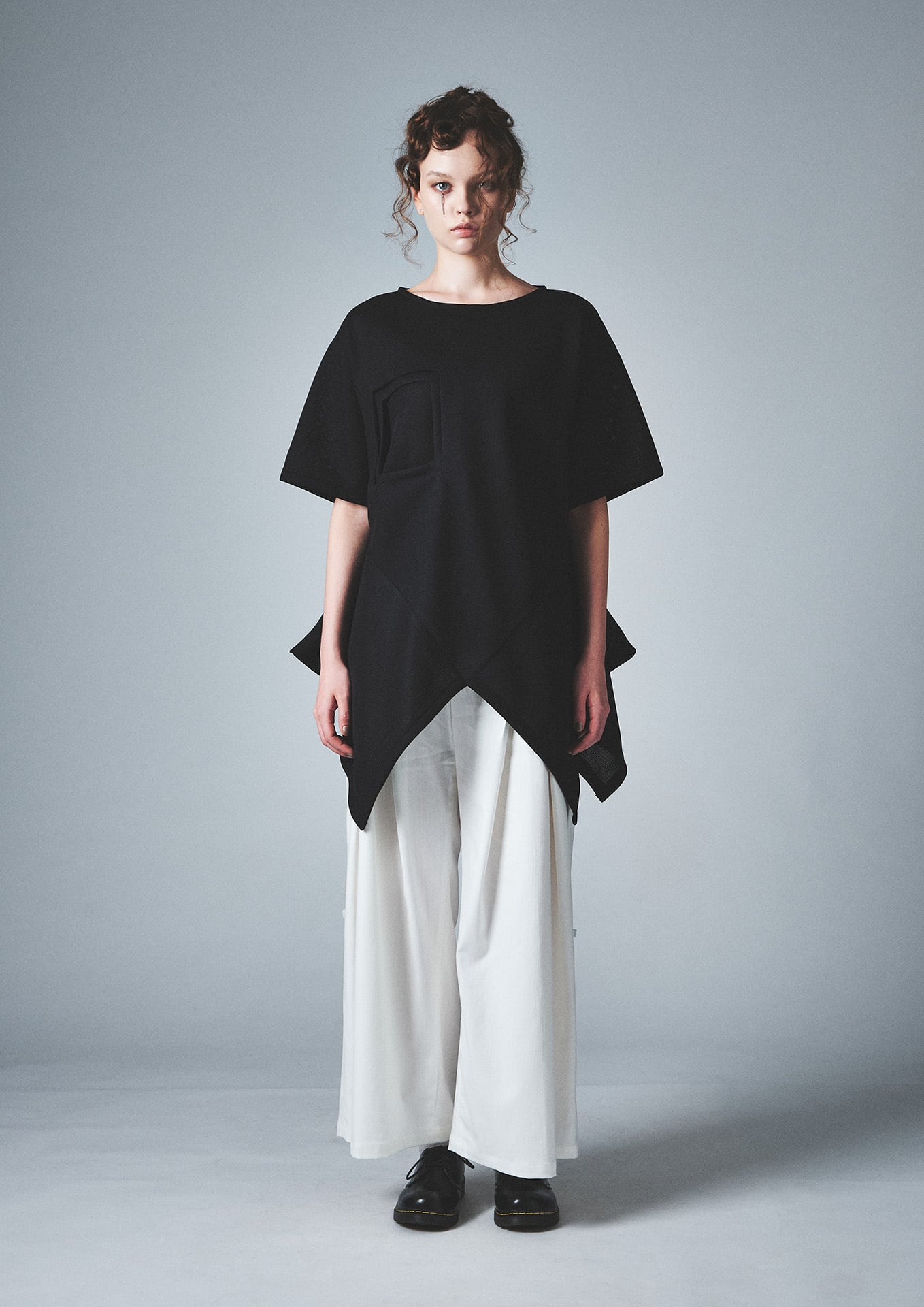 素材のコントラストが生む奥行きに加え、前面にクロス状に大きく取ったタックが、デザイン性と動きやすさを両立しています。
