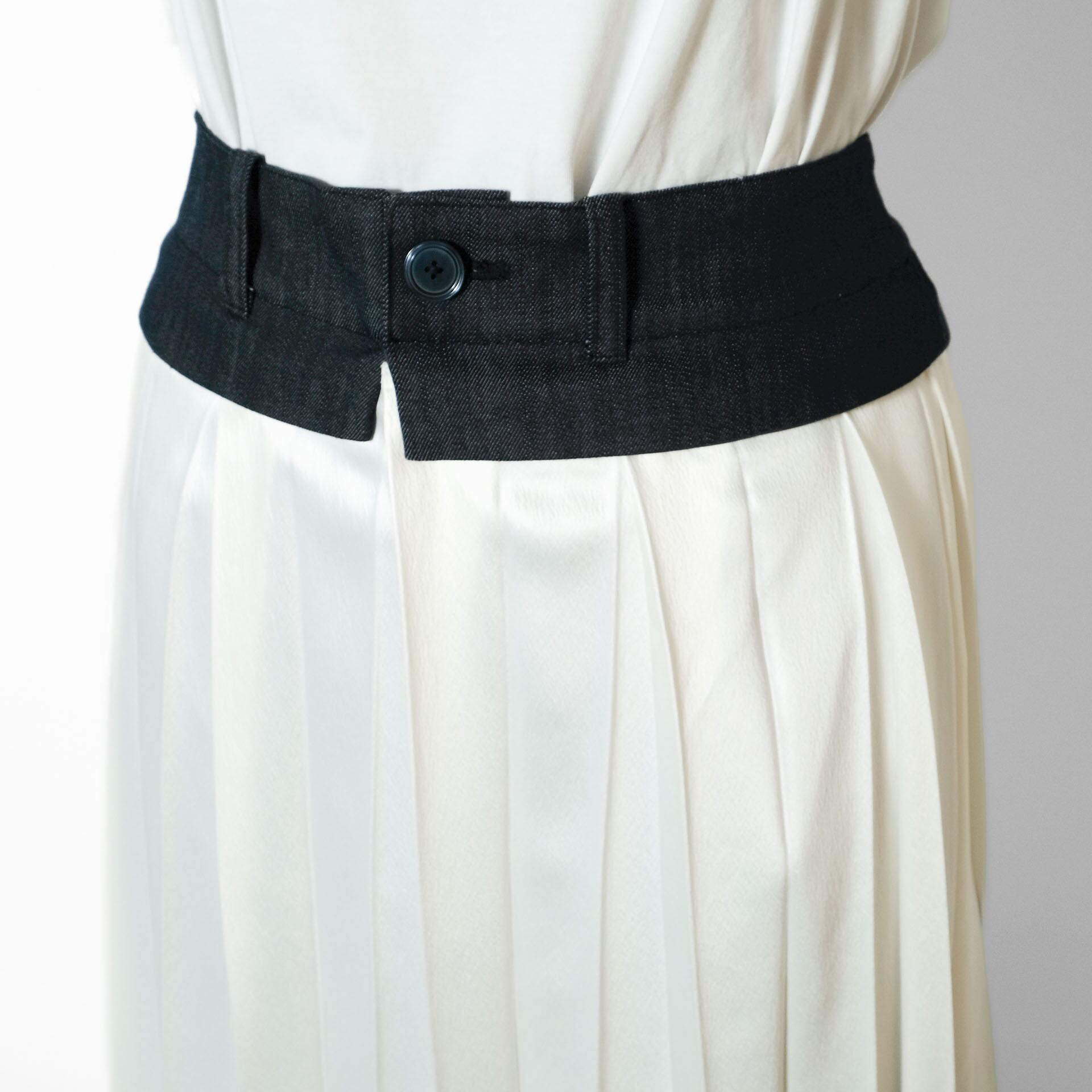 ウエストベルト下に配置されたフラップは、デザインアクセントとしての役割に加え、プリーツ布の端を自然に隠す機能も兼ね備えています。
