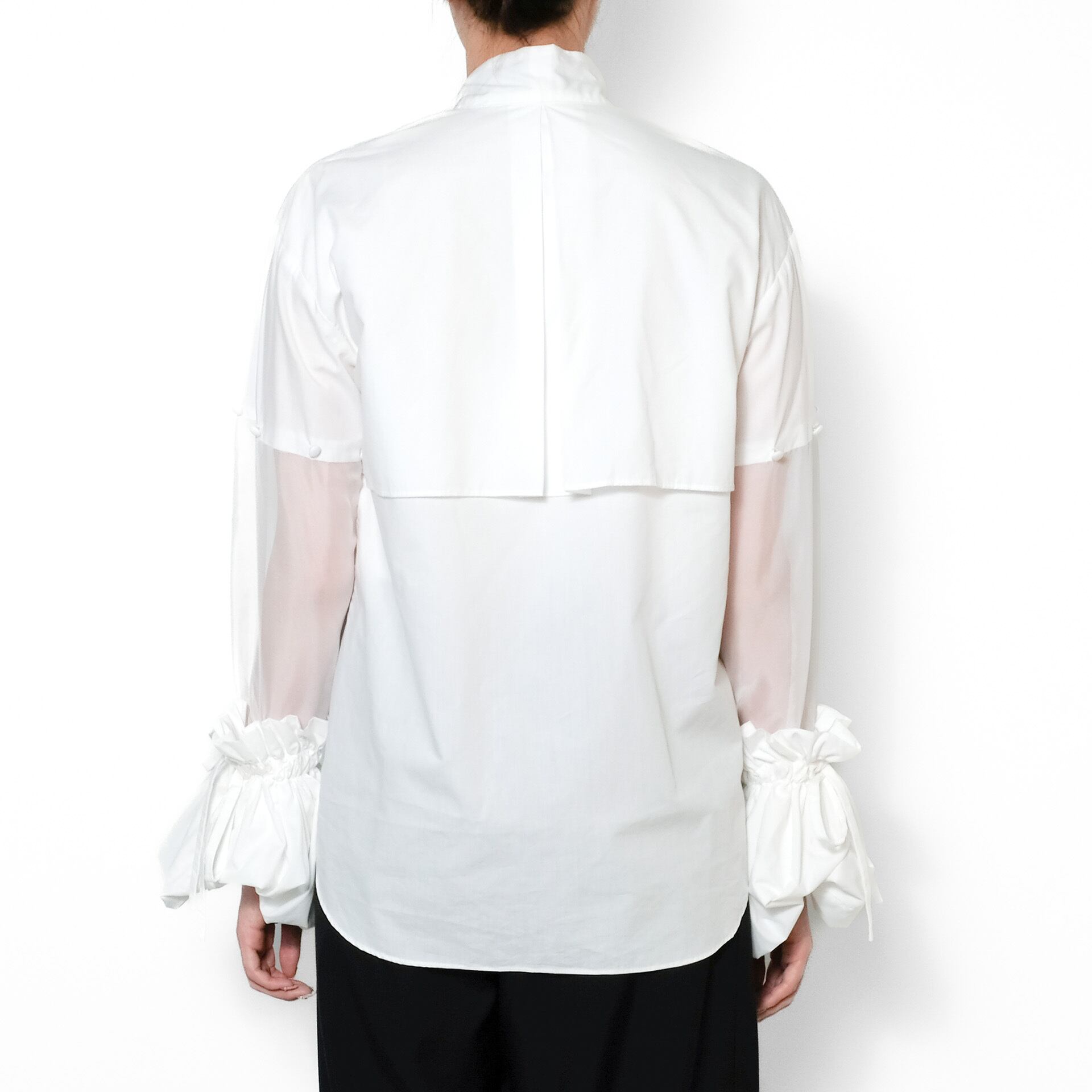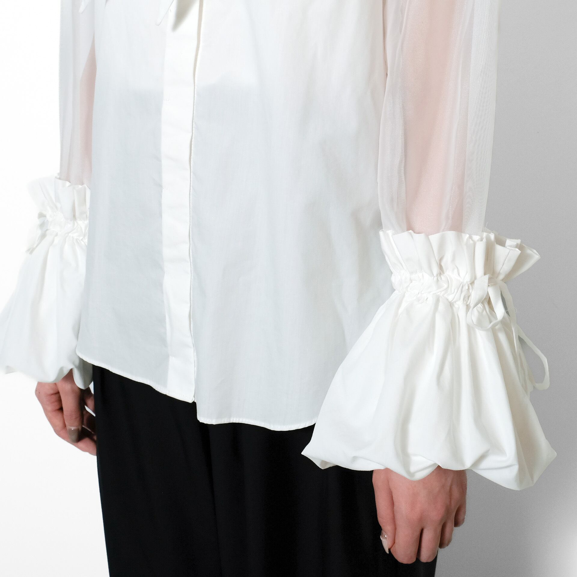 ドロップショルダーのパフスリーブは、オーガンジーとタイプライターの二重構造で仕立てられ、カフス部分で一体化されています。