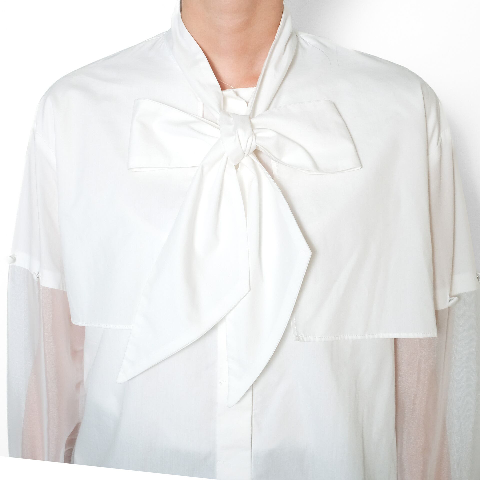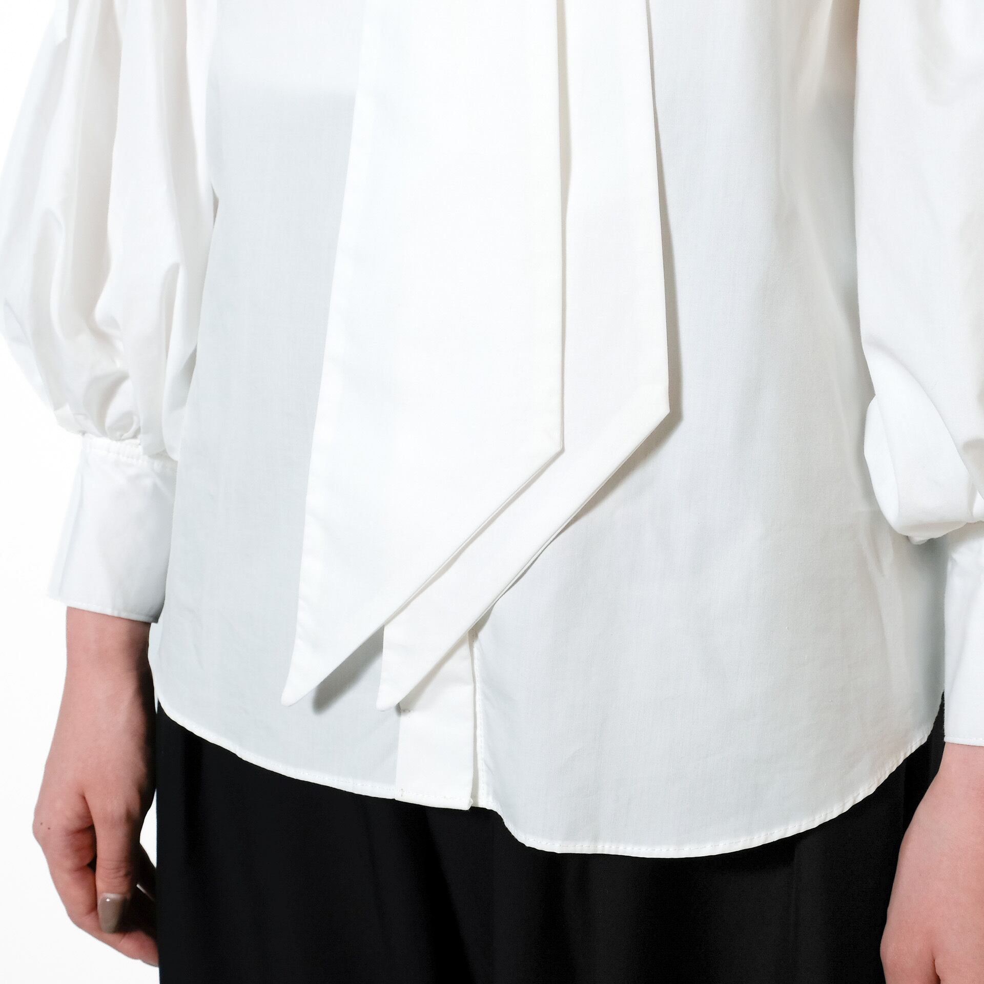 高密度のハリ感としなやかさを併せ持つコットンリヨセルタイプライターで仕立てた、ボウタイカラーブラウス。
