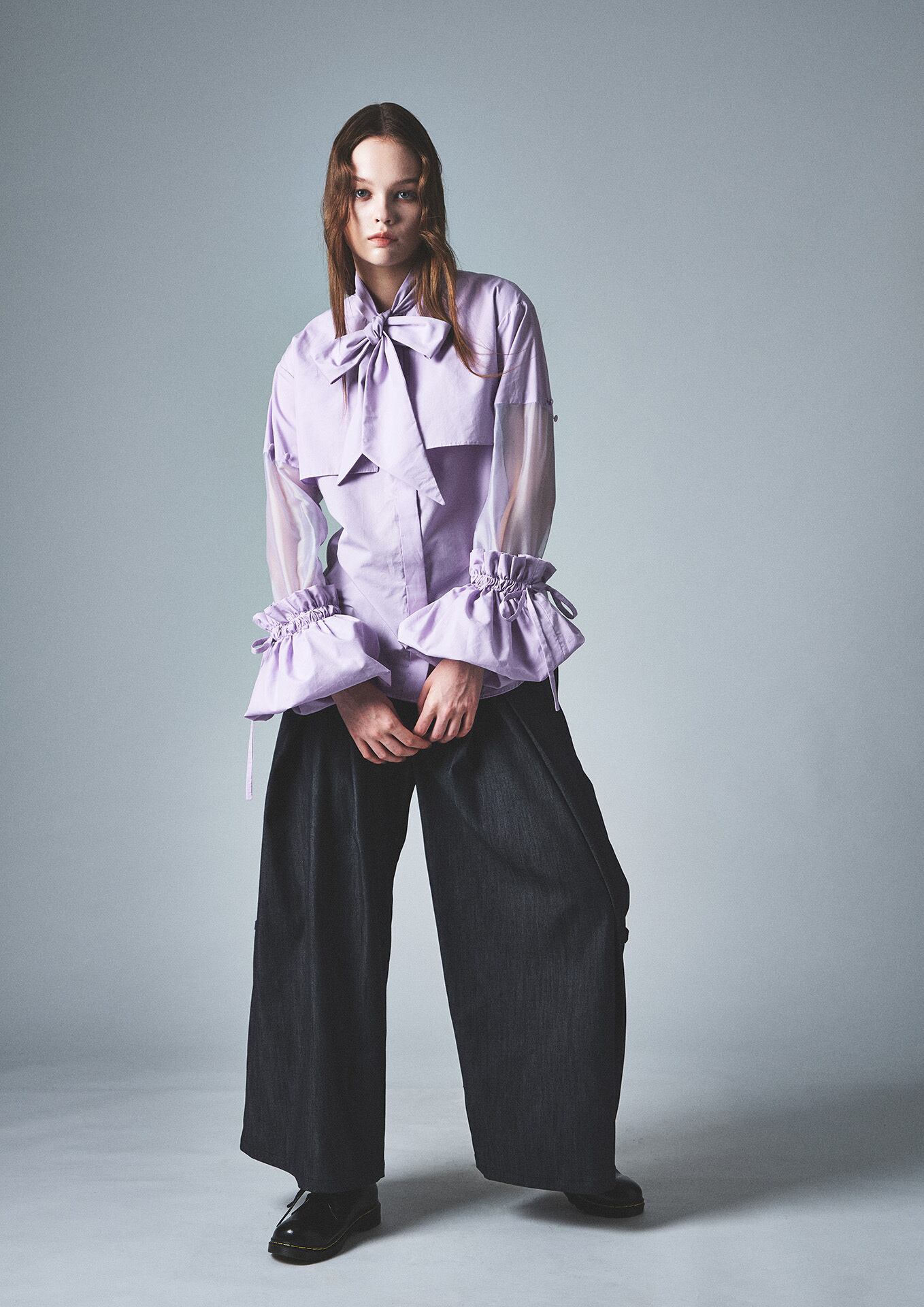 さらに、ドロップショルダーのパフスリーブをスライドさせると、内側からシアーな袖が現れ、シルエットが変化。ミニマルな構造の中に、動きと遊び心を秘めたデザインです。