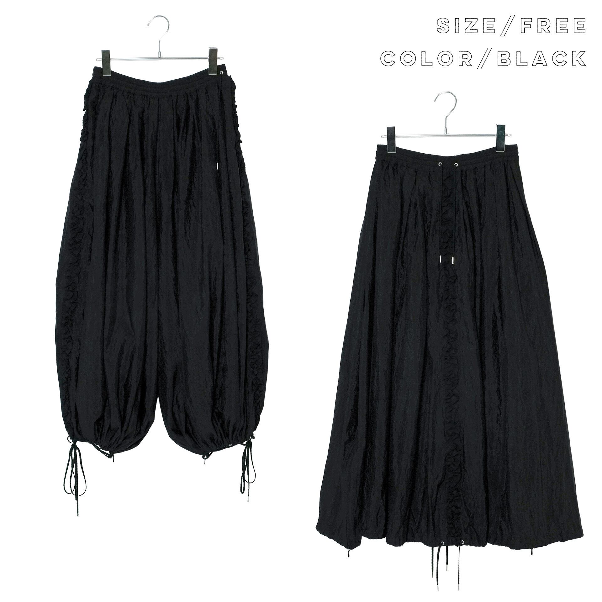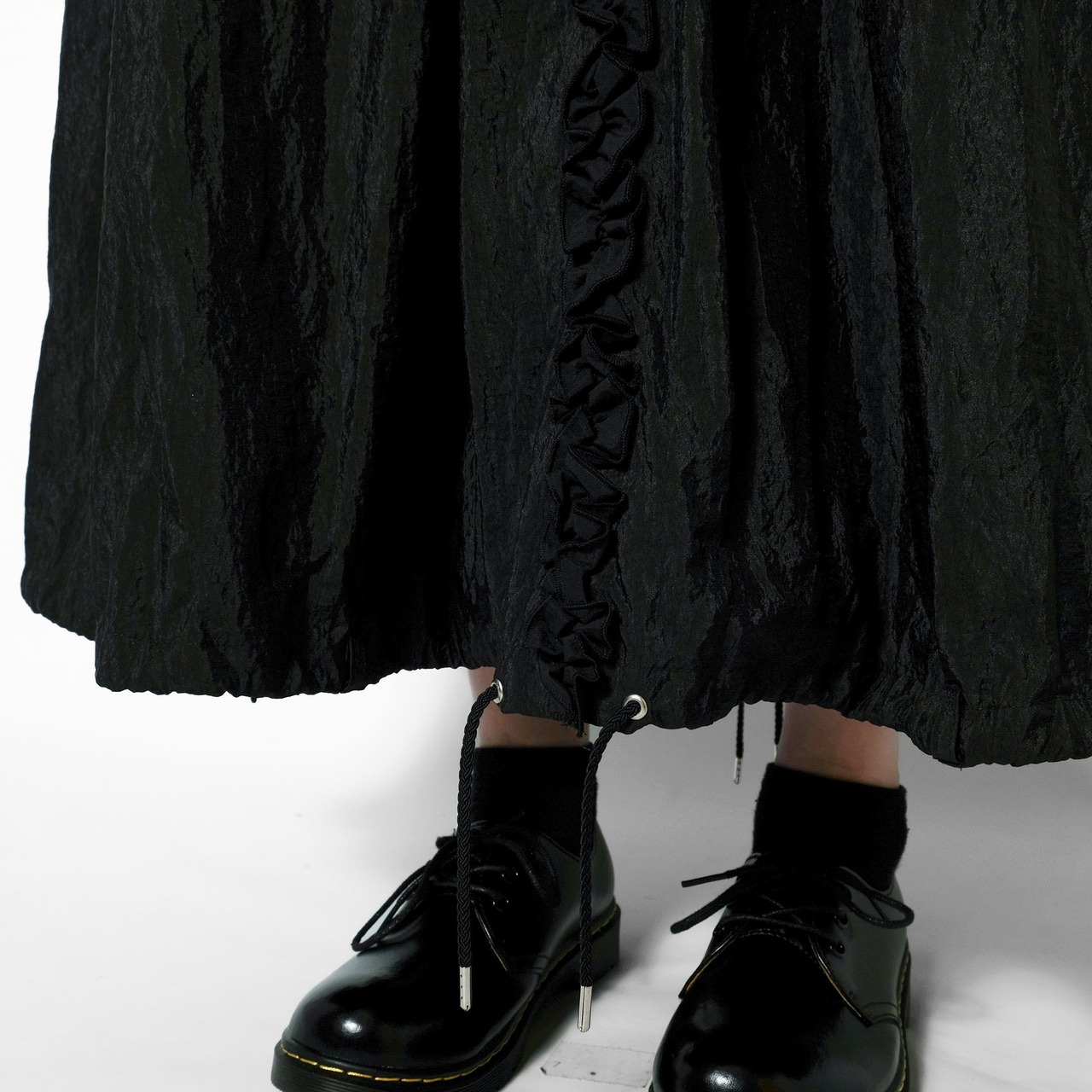 さらに、裾に施されたブレードを絞り、裾のループに通しながら巻き付けることで、バルーンシルエットへと変化。