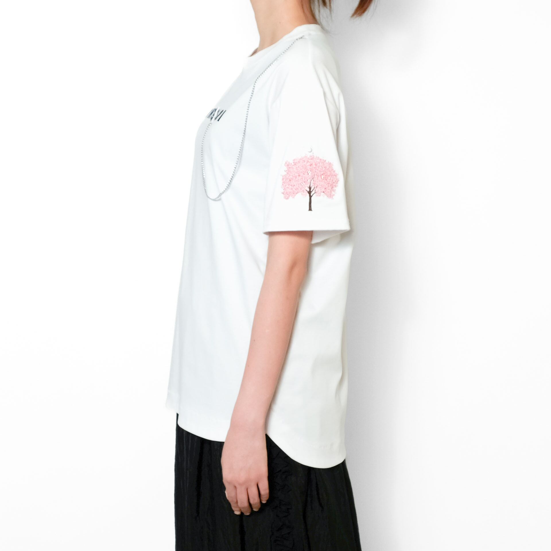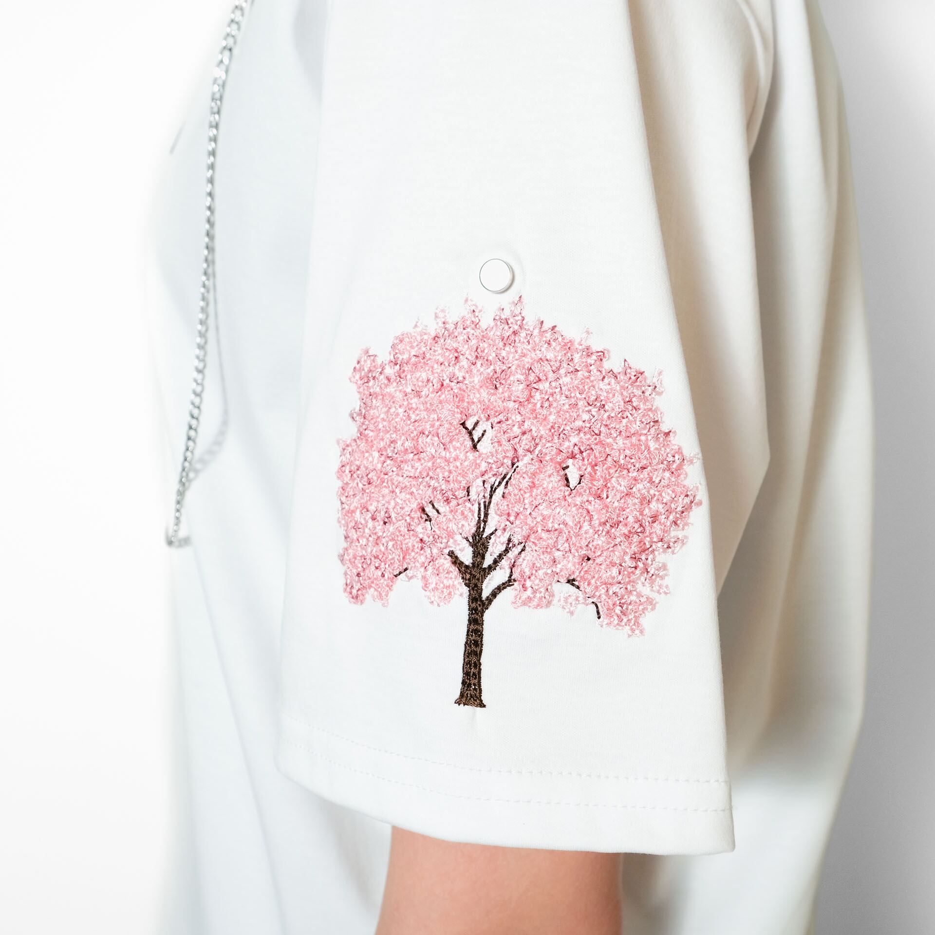 左袖にはリリーヤーンで仕立てた、立体的でリアルな桜の木の刺繍を配置。