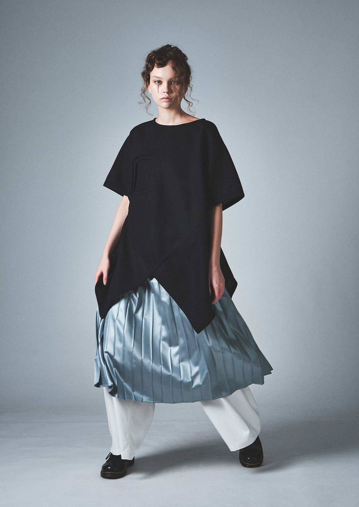 身頃にはバイアスに配置された四角い布が、着用時にふわりとドレープを生み出し、動きに合わせて表情を変えます。