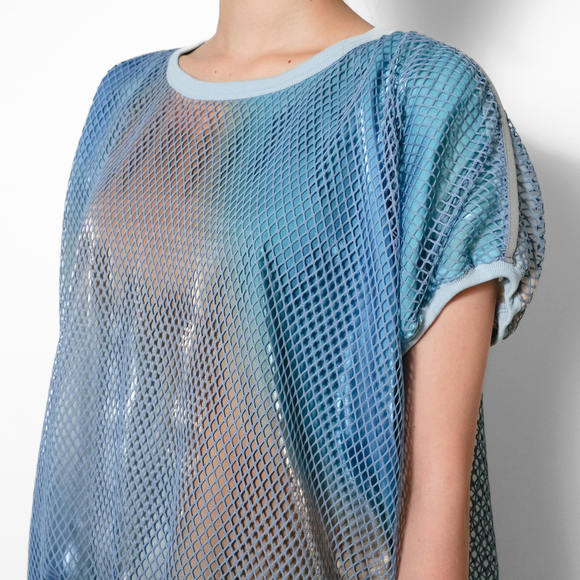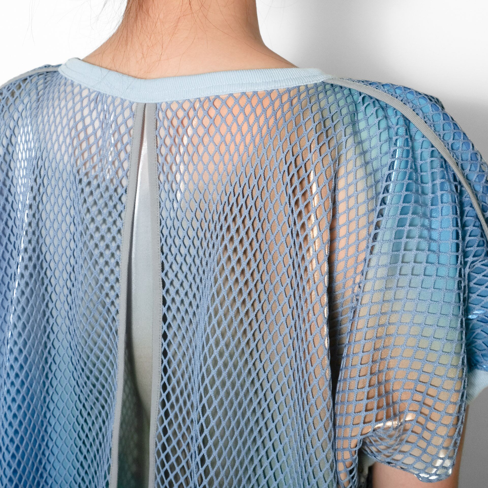 ネットの色によってサテンの色彩が変化して見える錯視効果も、この作品の魅力のひとつ。見る角度や動きによって印象が変わる、構造美と詩的な視覚体験を融合させた一着です。