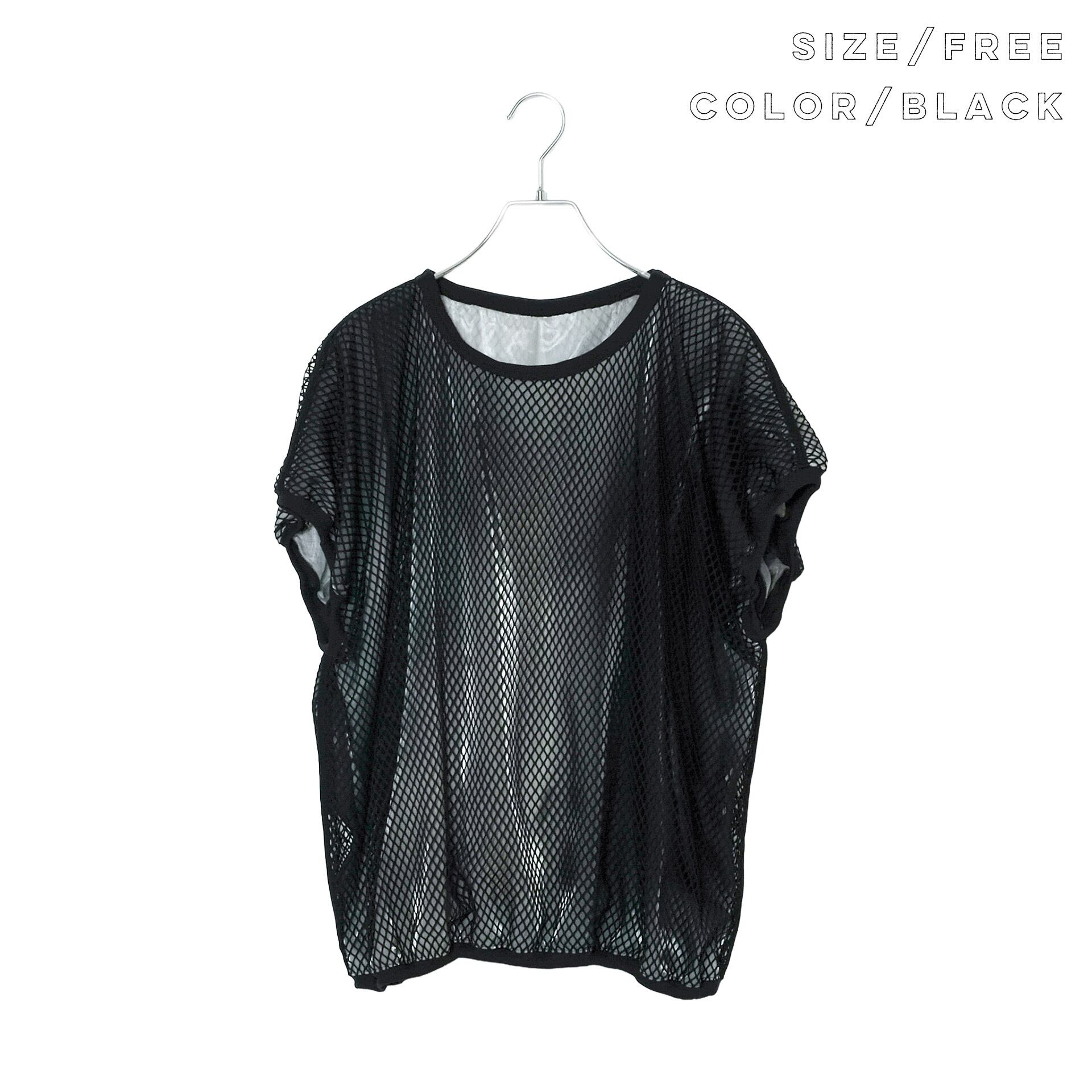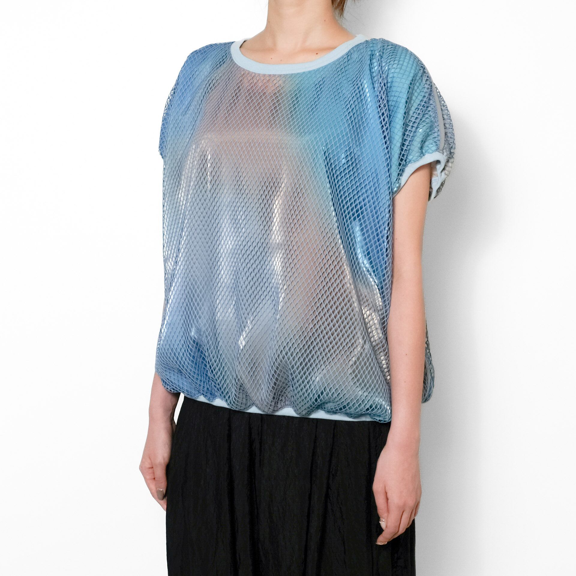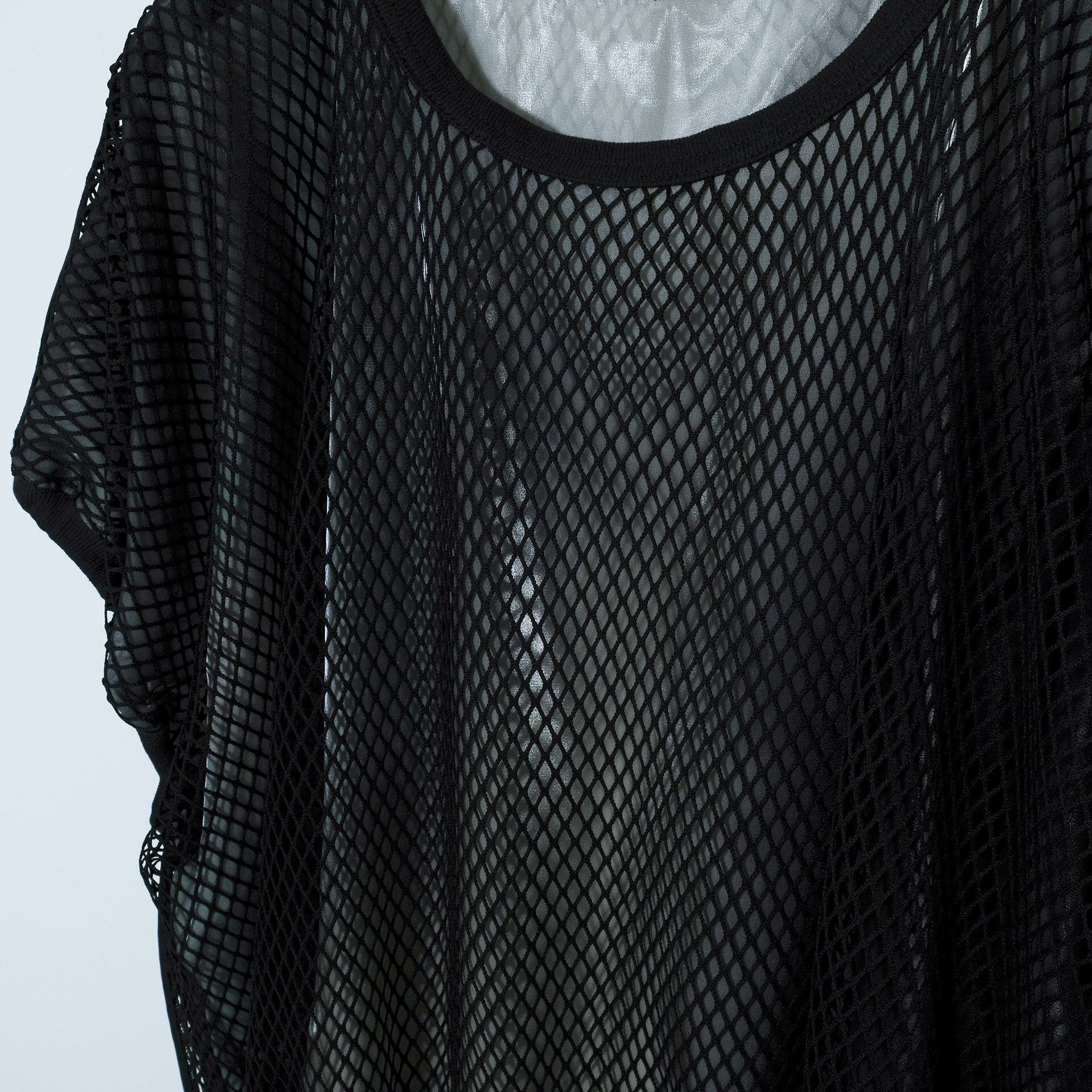 ダイヤ型の柔らかいネットチュールと、インクジェットプリントが施された光沢のあるサテンを重ねた、透け感を楽しむトップス。