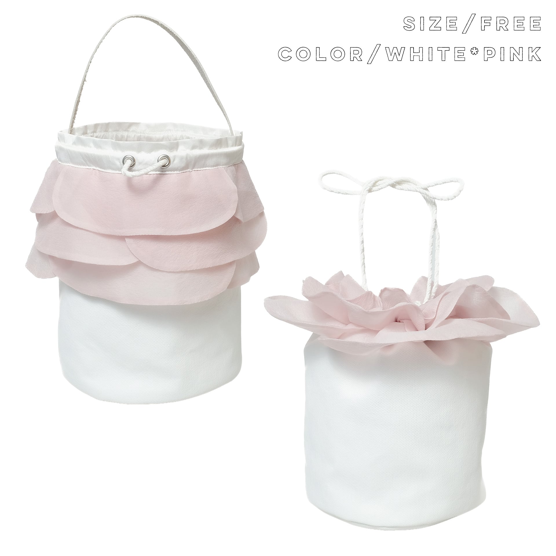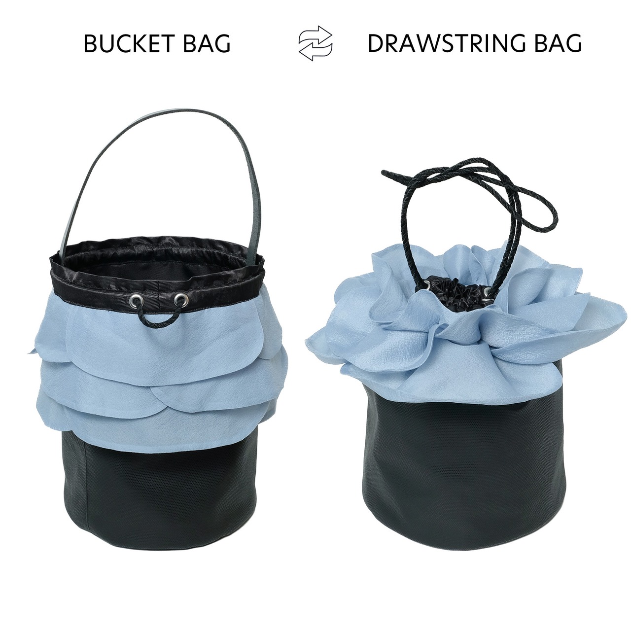 独自の凹凸のある風合いを持つエコレザーを花瓶に見立て、エアリーなオーガンジーが花びらのように揺らめく、遊び心満載のバケットバッグです。