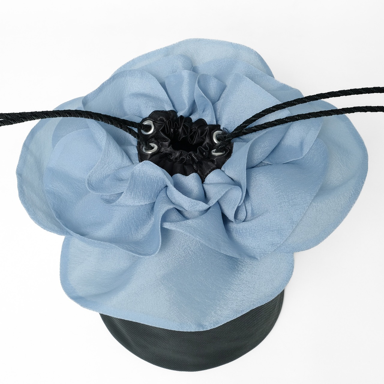 本体の口部分に通したスピンドルを絞ることで、オーガンジーが立ち上がりお花が咲いたようなデザインの巾着バッグに変身します。