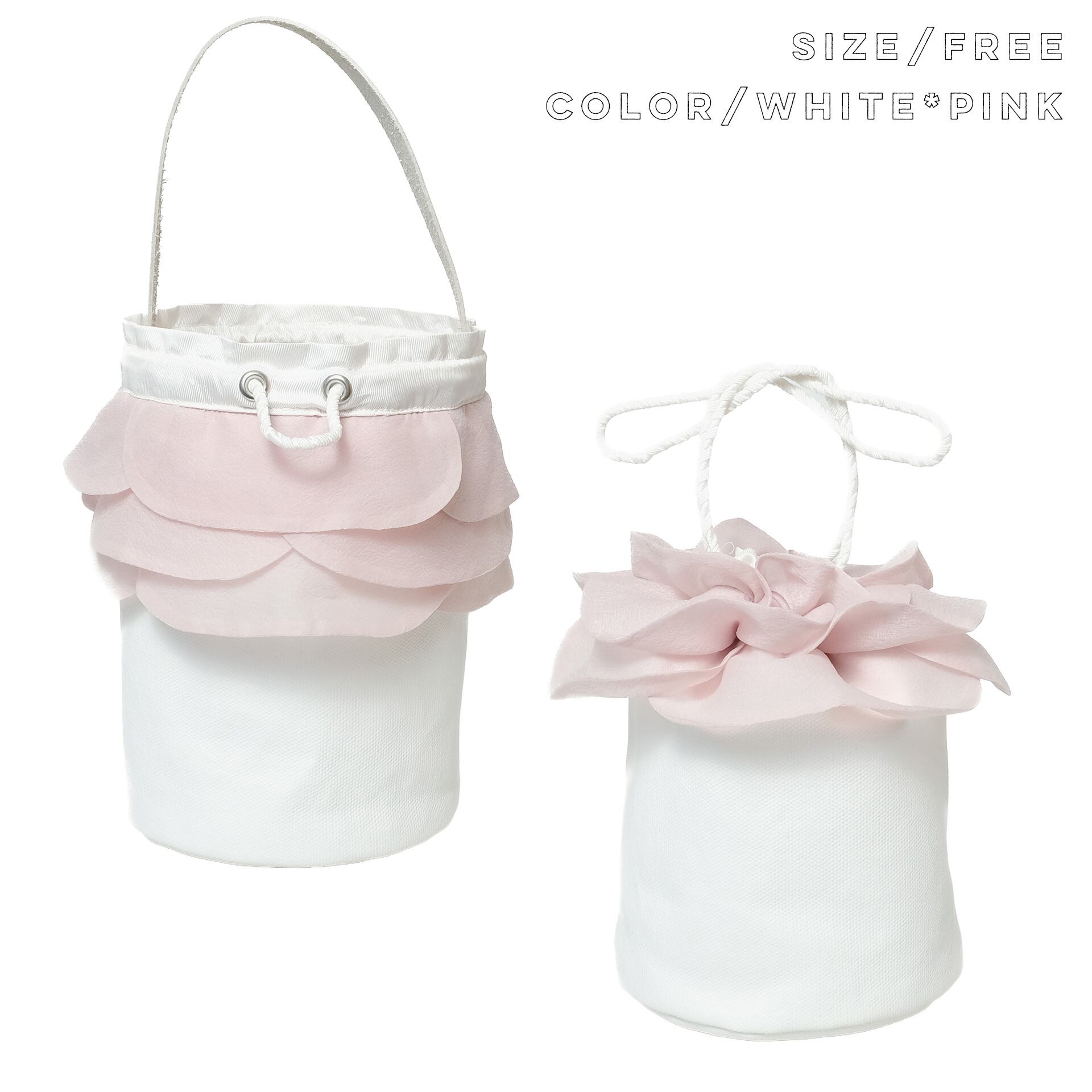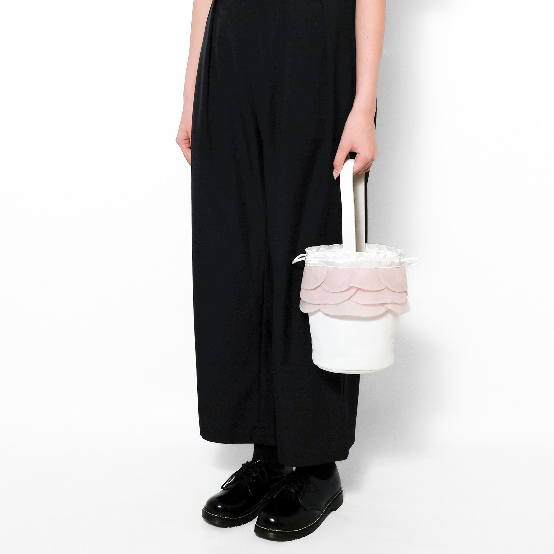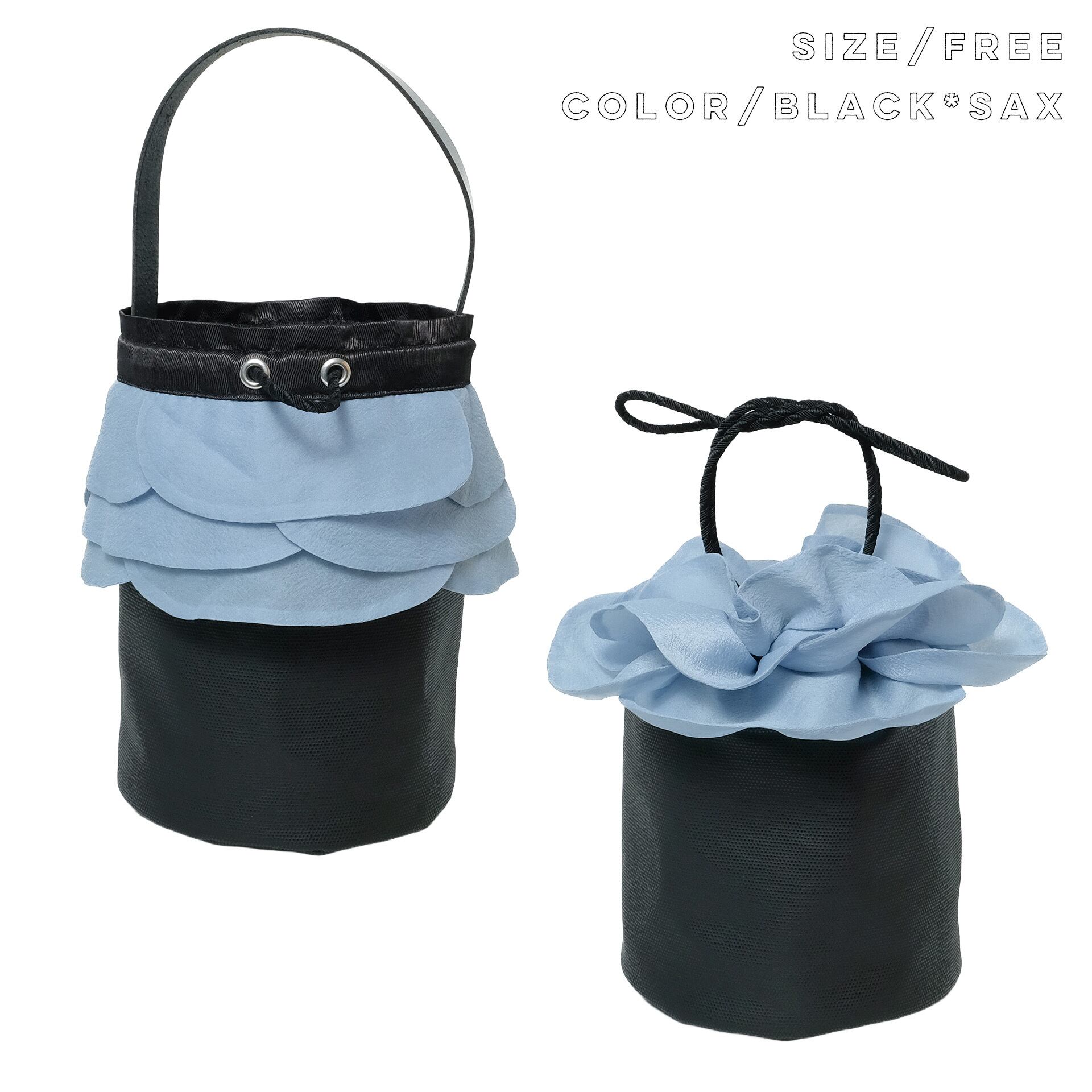 独自の凹凸のある風合いを持つエコレザーを花瓶に見立て、エアリーなオーガンジーが花びらのように揺らめく、遊び心満載のミニサイズのバケットバッグです。