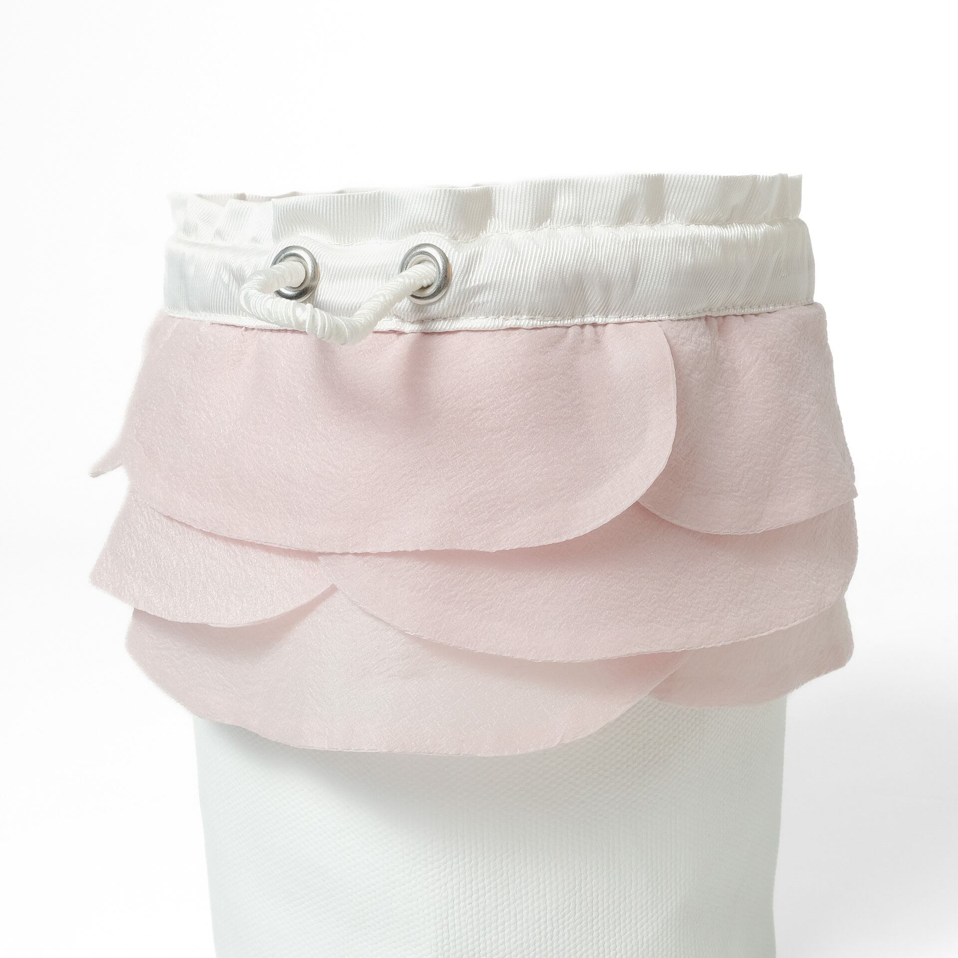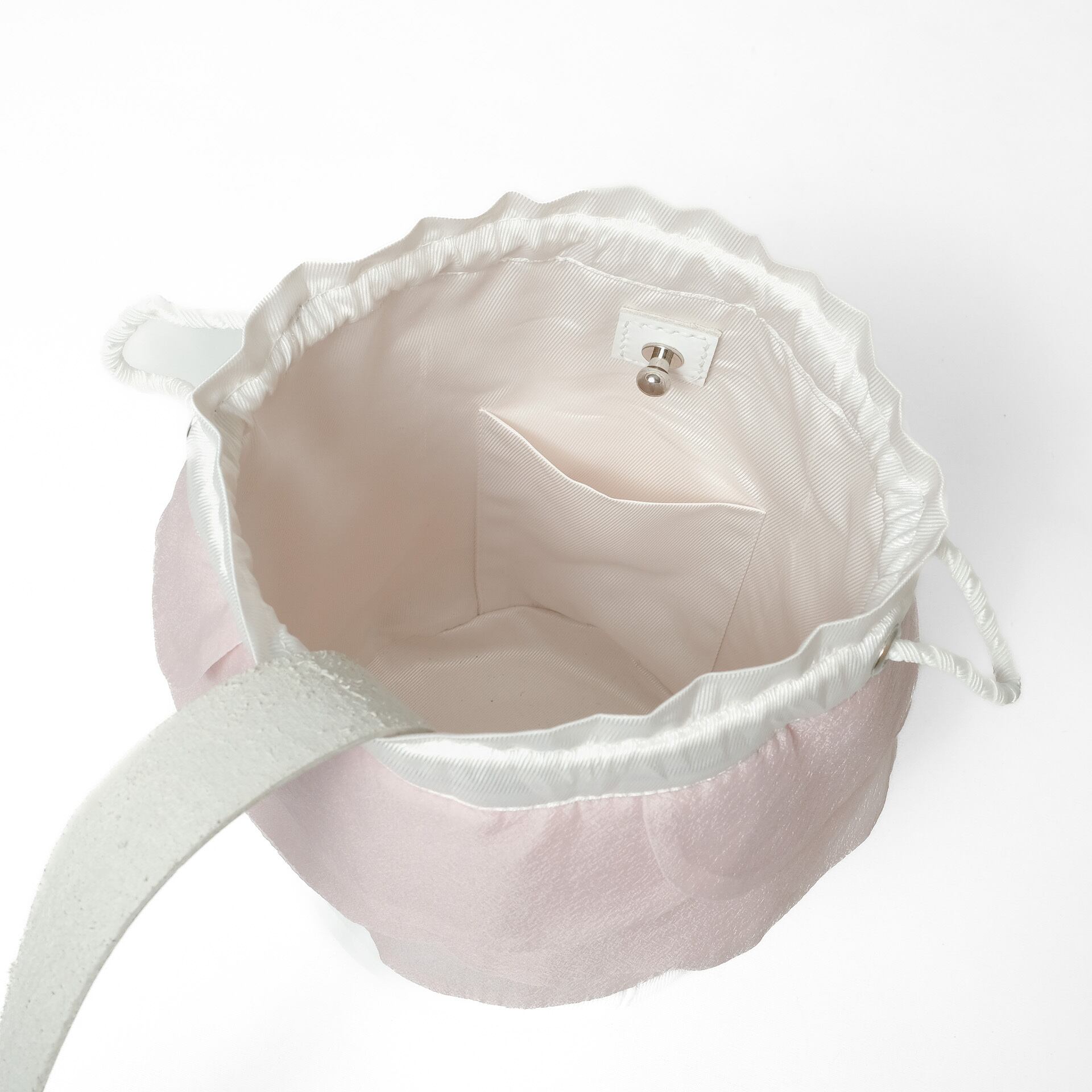 本体の口部分に通したスピンドルを絞ることで、オーガンジーが立ち上がりお花が咲いたようなデザインの巾着バッグに変身します。